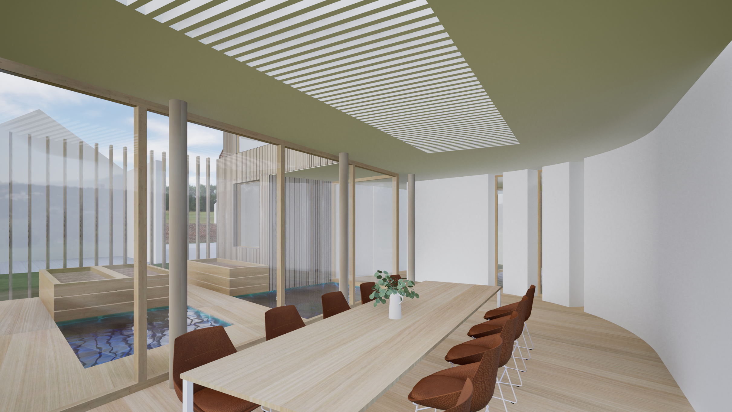 work as if you were a professional in creating 3d renders for architectural projects without changing any elements present in the original image make the visual of the new construction more realistic finally adjust the grain and lighting of the image to make it more cinematic in the background there are raised beds fill them with vegetable plants etc add a person make the textures as realistic as possible make the colours vivid and the image photo like do not change the cladding on the ceiling