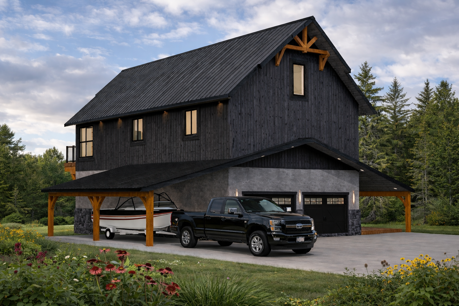 make this render look realistic this is a bright day steel roof on the house black stain wood house exterior