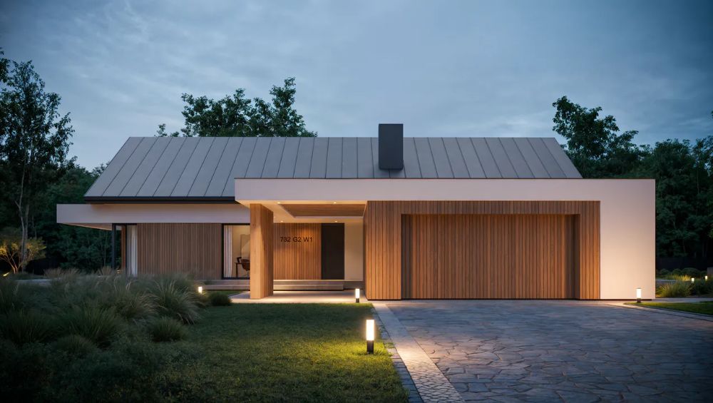 exterior shot remove the window on the left keep the colors consistent have more plants in the foreground have a few trees too