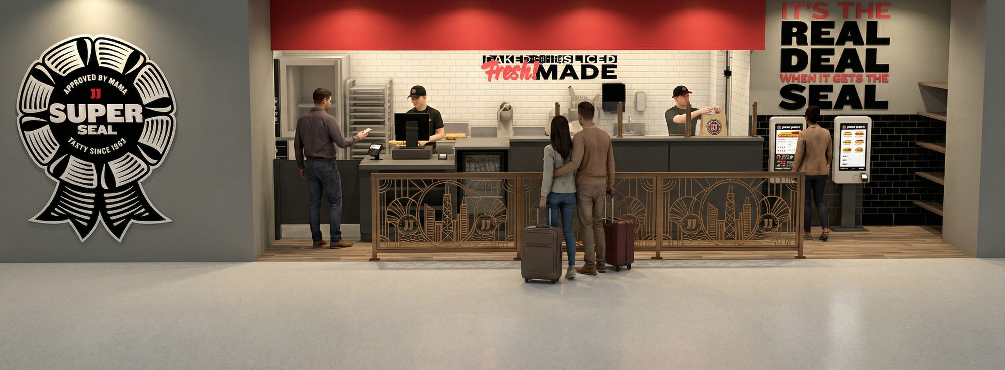 this is a proposed jimmy john s to be located in an airport transform the provided restaurant interior image into a high end photorealistic render with warm lit atmosphere and relaxed upscale energy while keeping everything exactly the same same proportions same equipment same ceiling curves same wall finishes same materials while making them look realistic and same spatial configuration add a couple of jimmy johns bags to the wooden pick up shelves directly to the right of the digital order kiosks do all of this while keeping the camera angle existing materials wall signage and other composition exactly the same