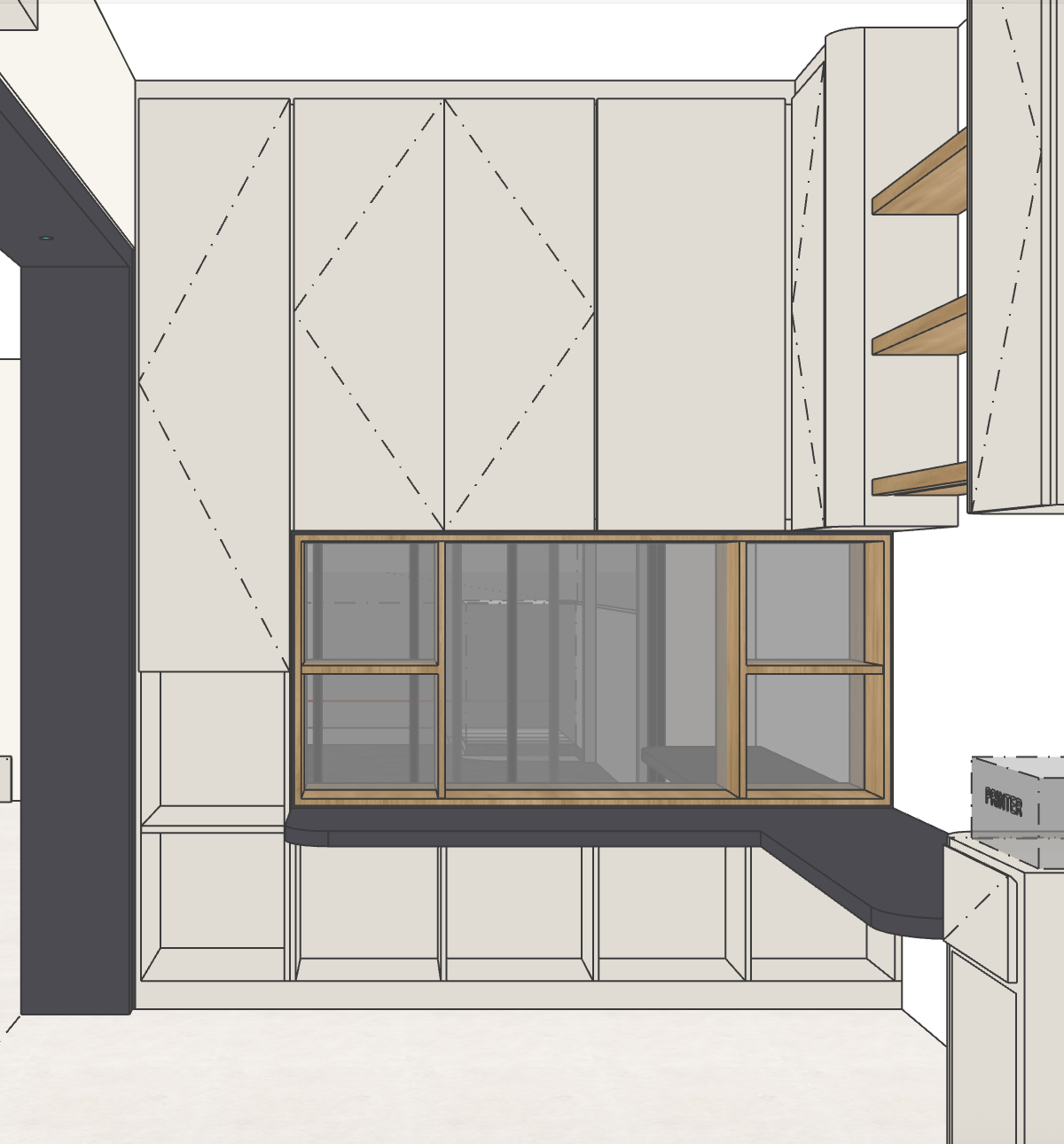 create a modern sleek interior design of a home office space use a minimalist aesthetic with clean lines and geometric forms the cabinets should have a light cream color incorporate solid charcoal grey accents for the desk shelves should be made of warm light wood to introduce an organic element the glass panel windows should have a slightly reflective surface framed in the same white oak wood aim for a bright airy atmosphere with natural lighting enhancing the calm and productive ambiance
