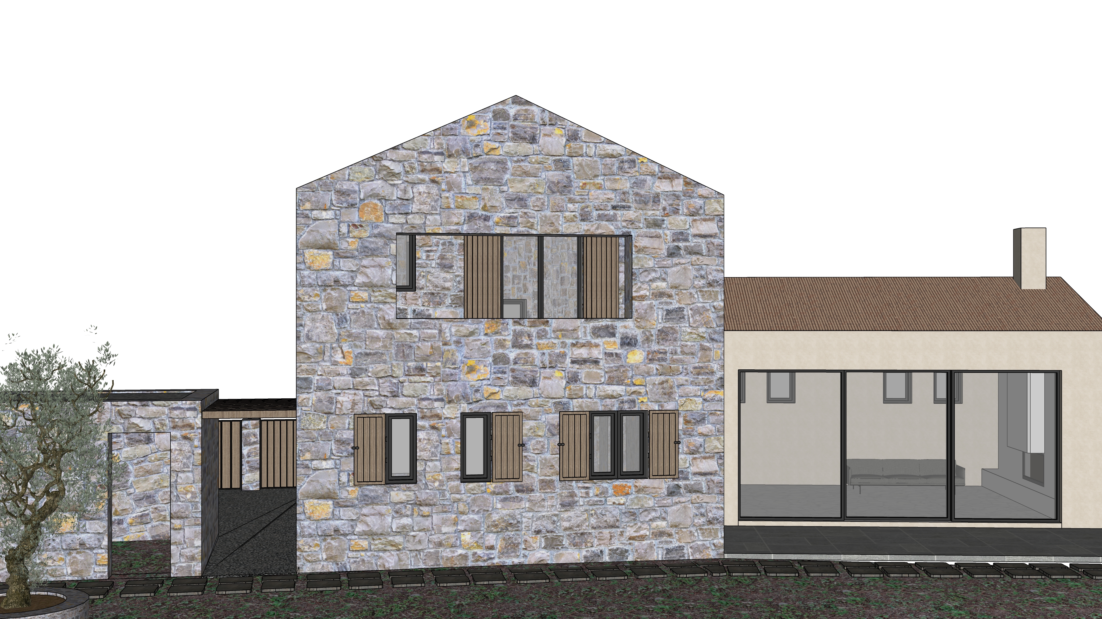 main prompt this is a house in thassos island by the sea the 2 storey volume is made of grey stone and the ground volume is plaster in cream tone the window frames are dark grey and the shutters are medium oak wood both volumes have a clay tile roof negative prompt do not change materials do not change geometry