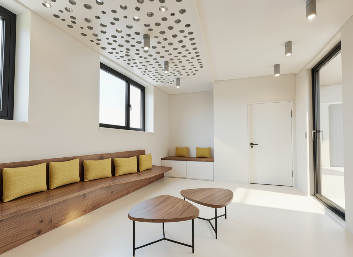 create a render in hyper realistic architectural visualization quality 8k resolution all objects furniture architectural features must remain in place do not add any objects or delete anything from the image the spatial configuration must remain unchanged the ground is more white beige with a baseboard doors are white the reference image is the same space from another angle metallic part of windows is black render source image ceiling with small wholes of 16 mm on the part on the left with no reflexion more ambient light and less natural light the banket is with a comfortable base made from textile wood and texture the tables are with wood