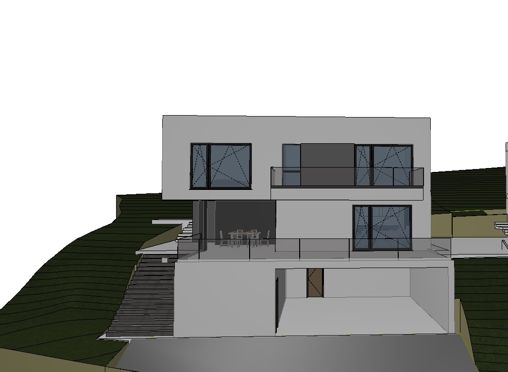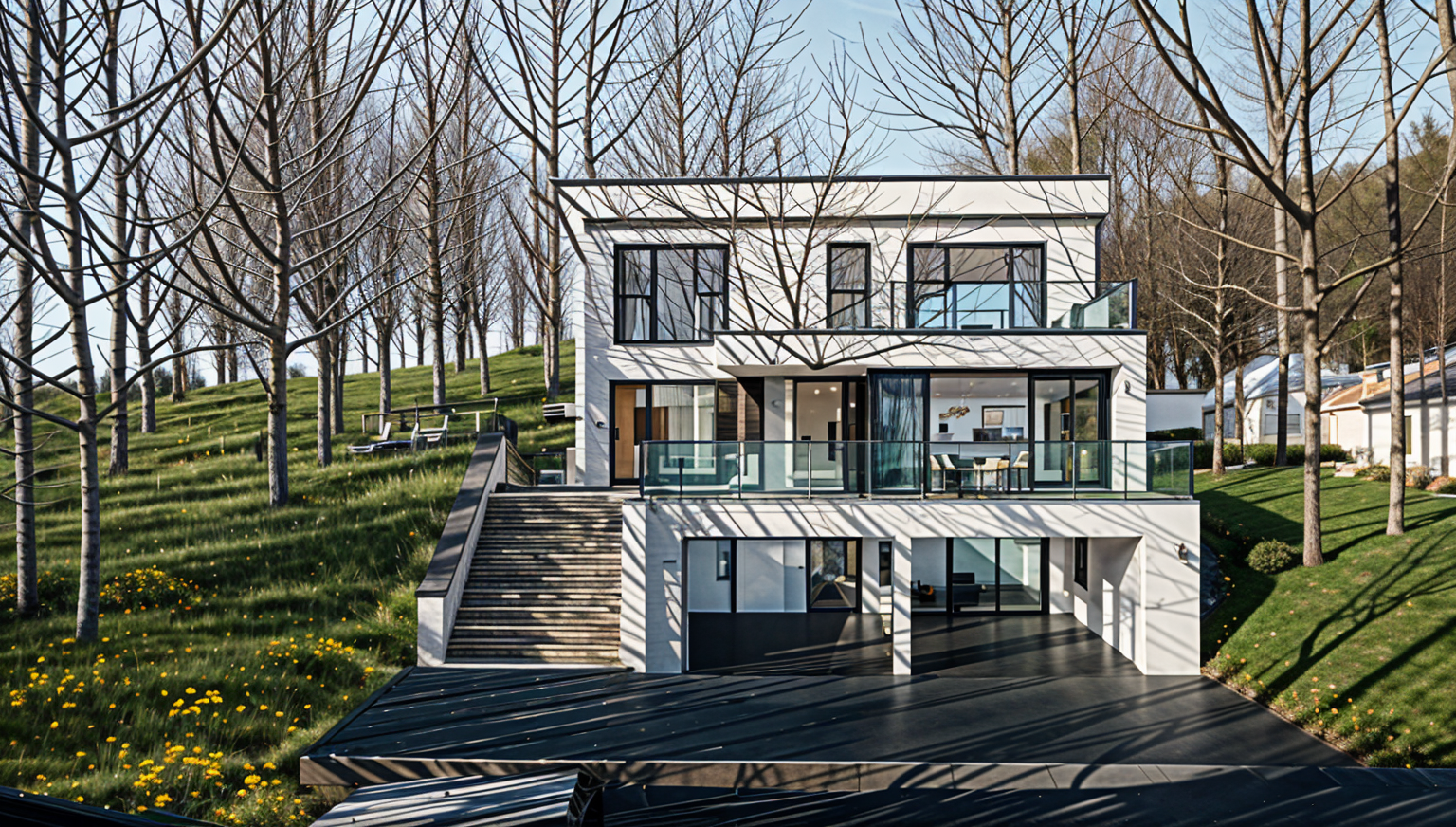 modernist exterior shot a beautifully rendered modern minimalist house set amidst a serene natural environment the house features angular wooden structures with a dark gray and black exterior large glass windows reflect the subtle hues of the surrounding landscape the wooden siding has warm earthy tones like soft browns and is combined with sleek contemporary black trimming the atmosphere is tranquil and the lighting is soft mimicking a gentle morning or late afternoon light the ground is adorned with patches of green moss and vivid yellow wildflowers adding a burst of color and life the surrounding trees are leafless drawn with delicate thin black lines indicating the late autumn season shadows of the trees create an intricate pattern on the house and the ground in varying shades of gray and brown the entire setting feels both modern and natural embracing simplicity and elegance architecture white facade keep windows from concept the background is forest please preserve the architecture and proportions of the building behind the building we have a slope and a forest