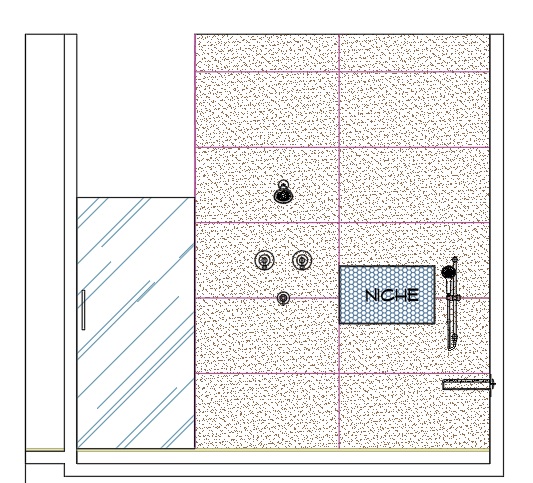 render this shower area realistically stay true with the scale in the layout using 48 x 24 lightstone traverten for the niche as shown using mother or pearl fan mosaic use stainless steel schluter on all sides of niches and the edge of tiles on the right there is floating shower bench