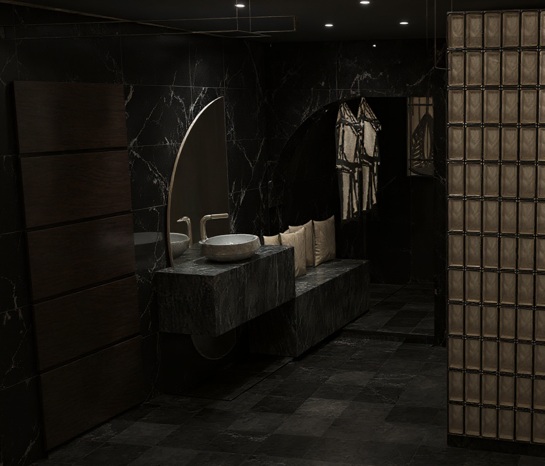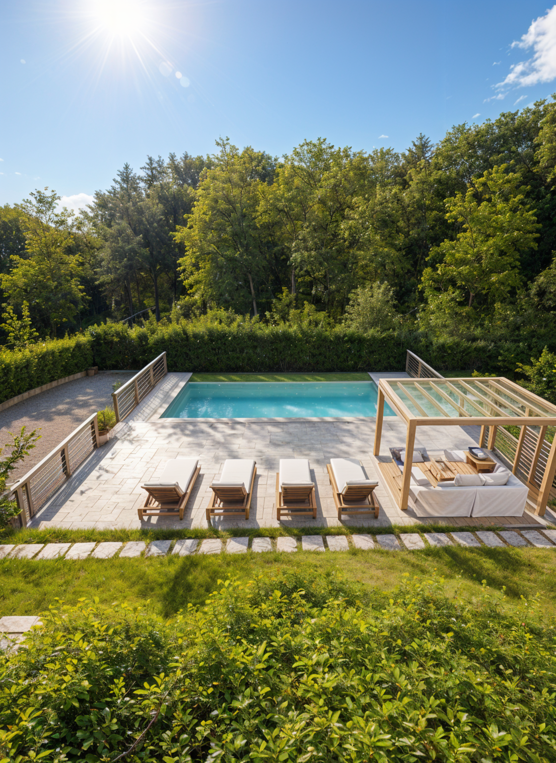 an infinity pool in a courtyard sorrounded by trees the trees are reflected on the top of the pool the solarium is made of tiles don t change the design and the object of the project