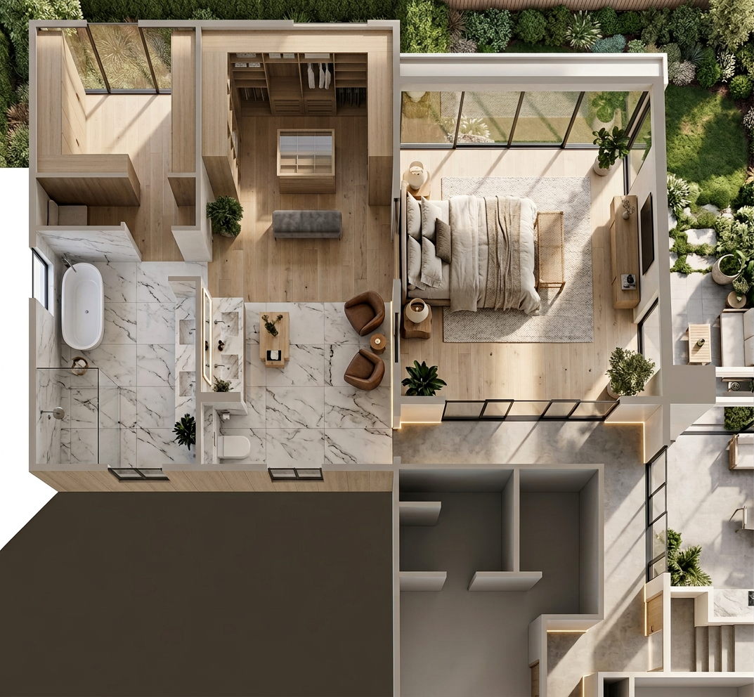 convert this floor plan into a realistic isometric 3d view of a full house show the space from an elevated angle with furniture walls and details visible global flooring living areas circulation polished waxed concrete floors throughout all main living spaces palette warm beige grey tones smooth matte finish with subtle light reflections seamless transitions between rooms bathroom sdb master suite grade italian walk in shower with frameless floor to ceiling glass panel rainfall ceiling showerhead freestanding sculptural bathtub organic form matte stone finish double sink vanity with stone countertop wall mounted faucets integrated under mirror lighting floor walls large format beige porcelain stoneware tiles honed finish tight grout lines mediterranean warmth with contemporary precision dressing room full perimeter built in closets flush panel doors floor to ceiling height integrated handles open central circulation axis warm beige lacquered or natural wood finish coherent with the global mediterranean palette home office bureau dedicated working office setup structured desk with integrated computer workstation ergonomic layout built in shelving or cabinetry ambient and task lighting layered materials echoing waxed concrete and warm wood tones of the main spaces wc laundry room interior living dining open kitchen flooring seamless waxed concrete throughout warm beige grey tone matte polished finish no transitions between zones the flooring flows continuously from entry through living dining and kitchen areas living area low profile mediterranean seating deep linen or boucl sofas in warm sand tones aged brass or travertine coffee table subtle arched architectural details echoing the curved fa ade geometry ambient layered lighting recessed ceiling spots pendant warm light over dining dining area large raw stone or solid wood dining table 8 10 seats statement pendant lighting cluster above aged brass or woven rattan shades positioned to face the curved glazed wall and terrace view open kitchen with central island fully open kitchen integrated into the living space central island oversized waterfall edge in honed marble or concrete warm beige veining flush induction cooktop on island integrated seating on one side bar stools leather or linen kitchen cabinetry floor to ceiling flat panel doors matte greige lacquer or natural oak finish integrated appliances no visible handles stone or quartz backsplash continuous with countertop material exterior panoramic terrace 100m flooring large format stone effect porcelain pavers warm sand travertine tone continuous grid layout echoing the plan s tile pattern flush with interior threshold 20cm seuil noted on plan respected layout zones on terrace lounge transat zone to the right arc of the terrace daybed transats in weatherproof linen low side tables in teak or stone surrounded by planted mediterranean beds olive trees lavender grasses as seen in plan corners dining bbq zone rear center of terrace built in outdoor kitchen with integrated stainless barbecue stone countertop prep area long outdoor dining table in teak or concrete 8 seats parasol or retractable pergola above bar zone left wing of terrace arc freestanding or built in outdoor bar stone top bar stools integrated wine beverage cooler warm pendant lighting strung above landscaping floor plan reading semi circular curved glass fa ade left wing chambre 4 bedroom sde shower room en suite large open terrace beyond the curved wall chambre 4 king bed linen bedding warm sand tone built in wardrobes flush to walls waxed concrete floor warm beige grey window all ge 45cm sheer curtains natural light sde salle de douche walk in italian shower 80x80 receveur as per plan single wall hung vanity stone countertop beige honed porcelain stoneware floor walls matte black or brushed brass fixtures render 3 4 interior perspective chambre 4 facing curved fa ade use the same furniture as shows on the plan do not change the orientation of the floorplan