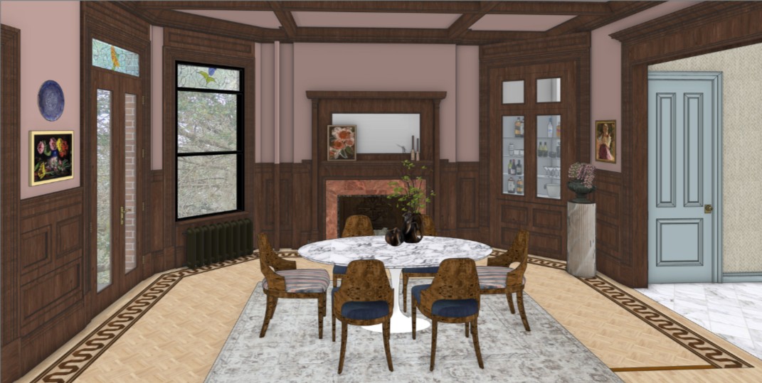 exactly as shown with some pretty morning light the walls are a medium rose and two end dining chairs have a striped velvet with blues ivory and pink