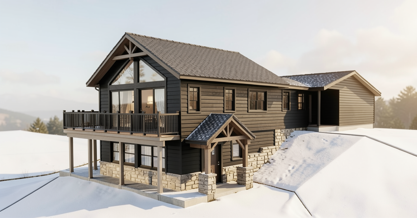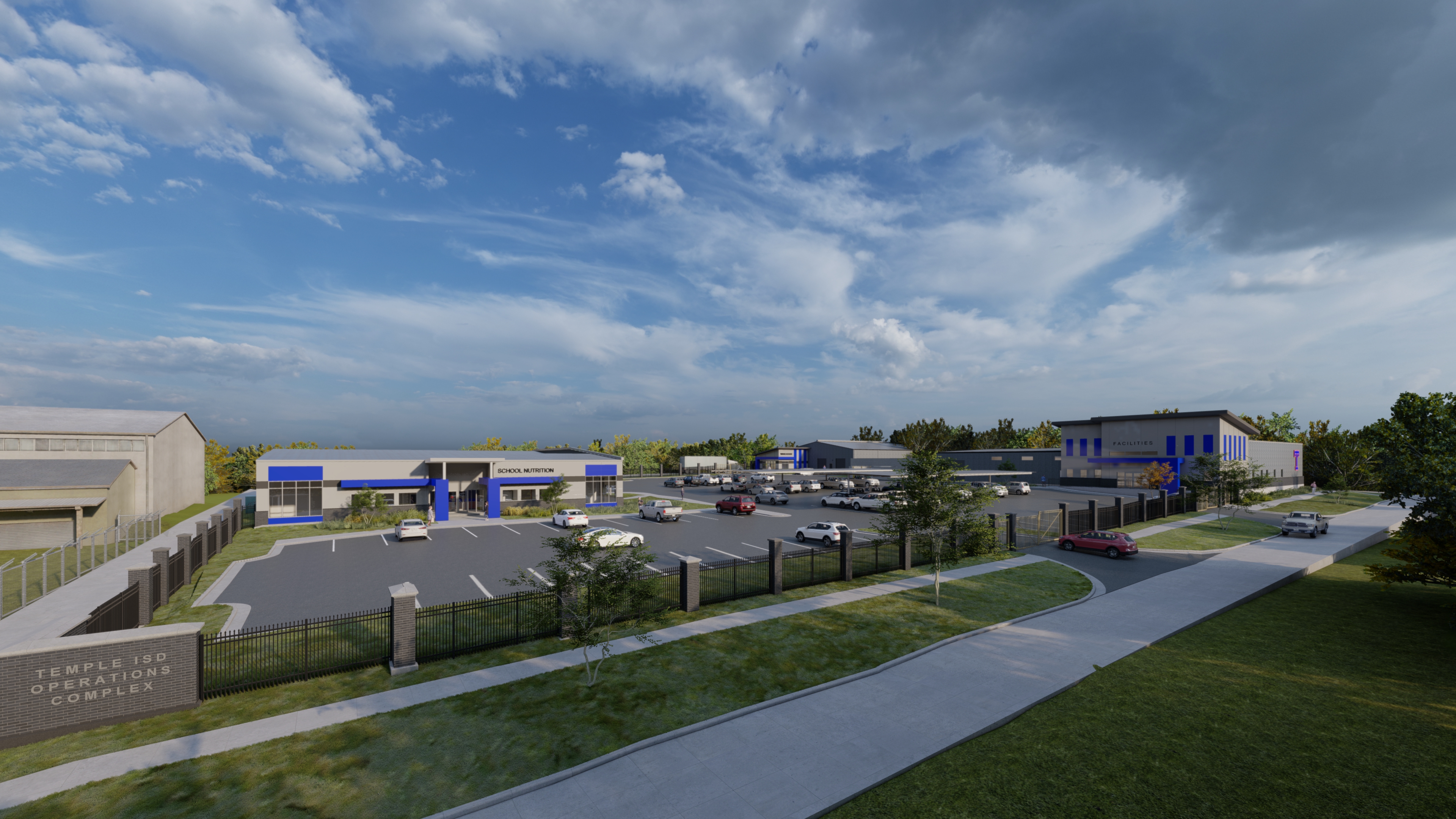 photorealistic architectural exterior render of the provided image preserving the existing building massing proportions and materials but elevating it to a high end realistic visualization add lush landscaped grass areas with a mix of native planting low shrubs ornamental grasses and small trees integrated naturally along the building edges and sidewalks include mature trees in the background only creating a dense green tree line with no visible buildings beyond populate the scene with realistic people casually walking standing and talking along the sidewalk dressed in modern casual attire scaled correctly to the architecture enhance the parking lot with realistic asphalt texture subtle tire wear painted striping and parked cars in neutral modern colors positioned naturally use cinematic realistic lighting with soft sunlight accurate shadows and global illumination lighting should feel warm inviting and professional similar to a golden hour or late afternoon architectural photo shoot apply high resolution materials with correct reflections roughness and depth ensure realistic sky ambient light and atmospheric depth render style ultra realistic high detail professional architectural visualization dslr photography look 8k quality sharp focus natural color balance realistic scale and proportions