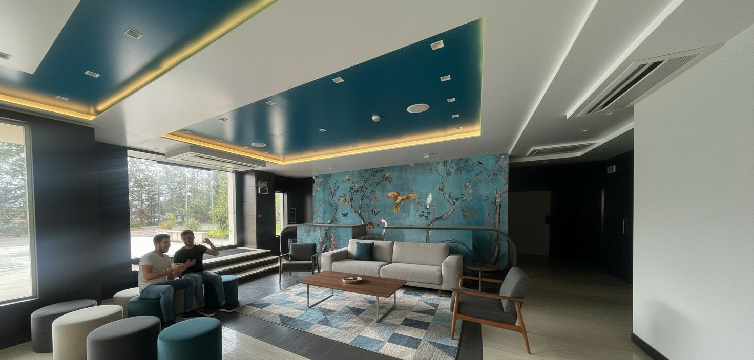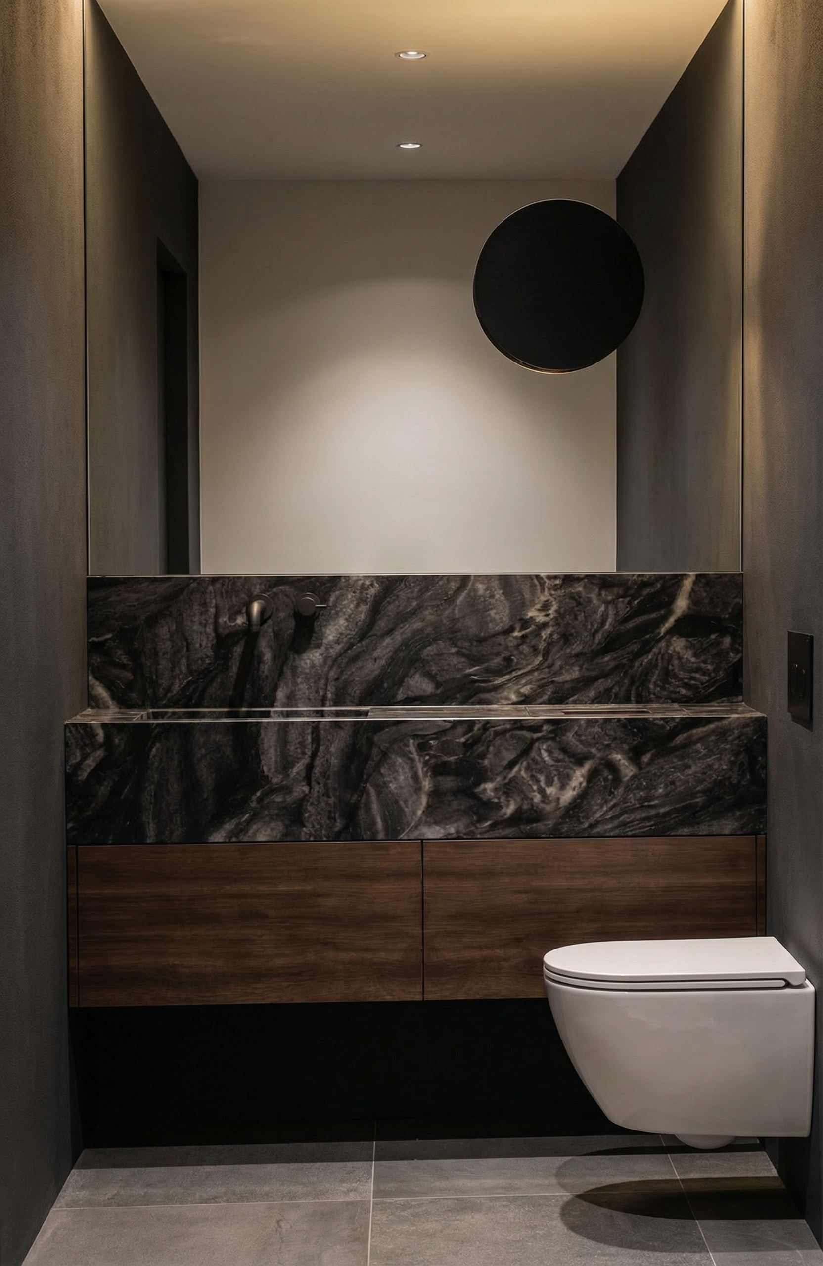 i want a photorealistic image of this render nothing may be changed about the content the floor is a gray tiled floor on the right is a large window through which natural sunlight must come the view from the window is a green garden with trees and organic green areas the garden is a minor detail in the render so it does not need to be very prominently visible preferably a slightly blurry visible garden the shelves have an led strip with lighting on the top and bottom
