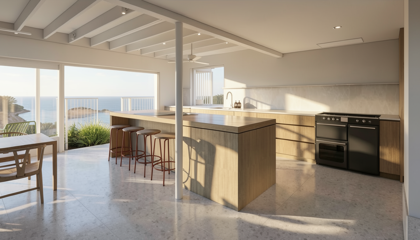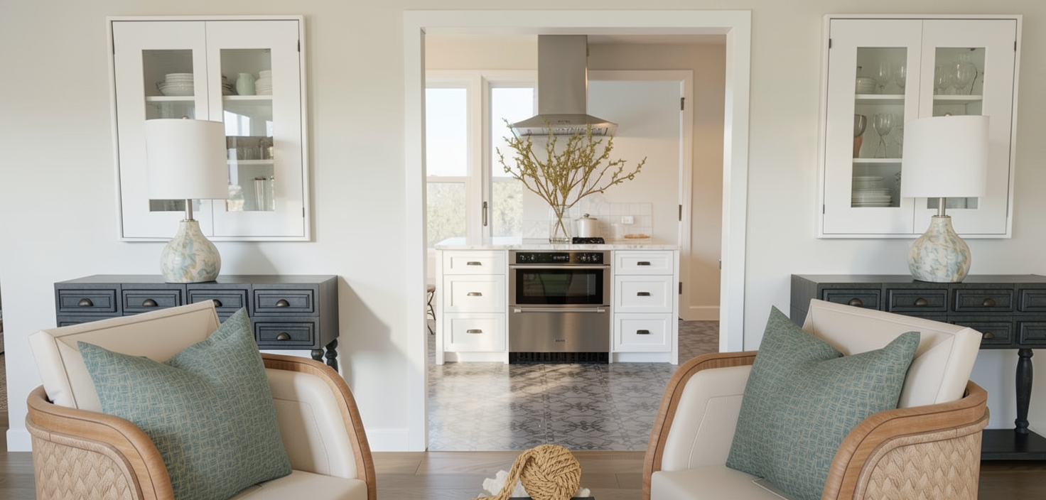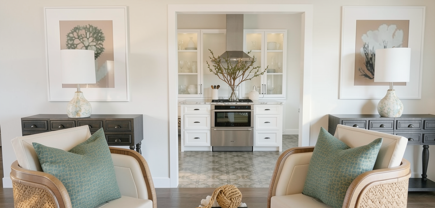 smooth white walls apartment building with gray railings gray metal coping on the roof parapets 6 foot high block wall at the back two cars parked on the two parking spots concrete driveway clean surroundings sunny california weather with an apartment building on the background and trees