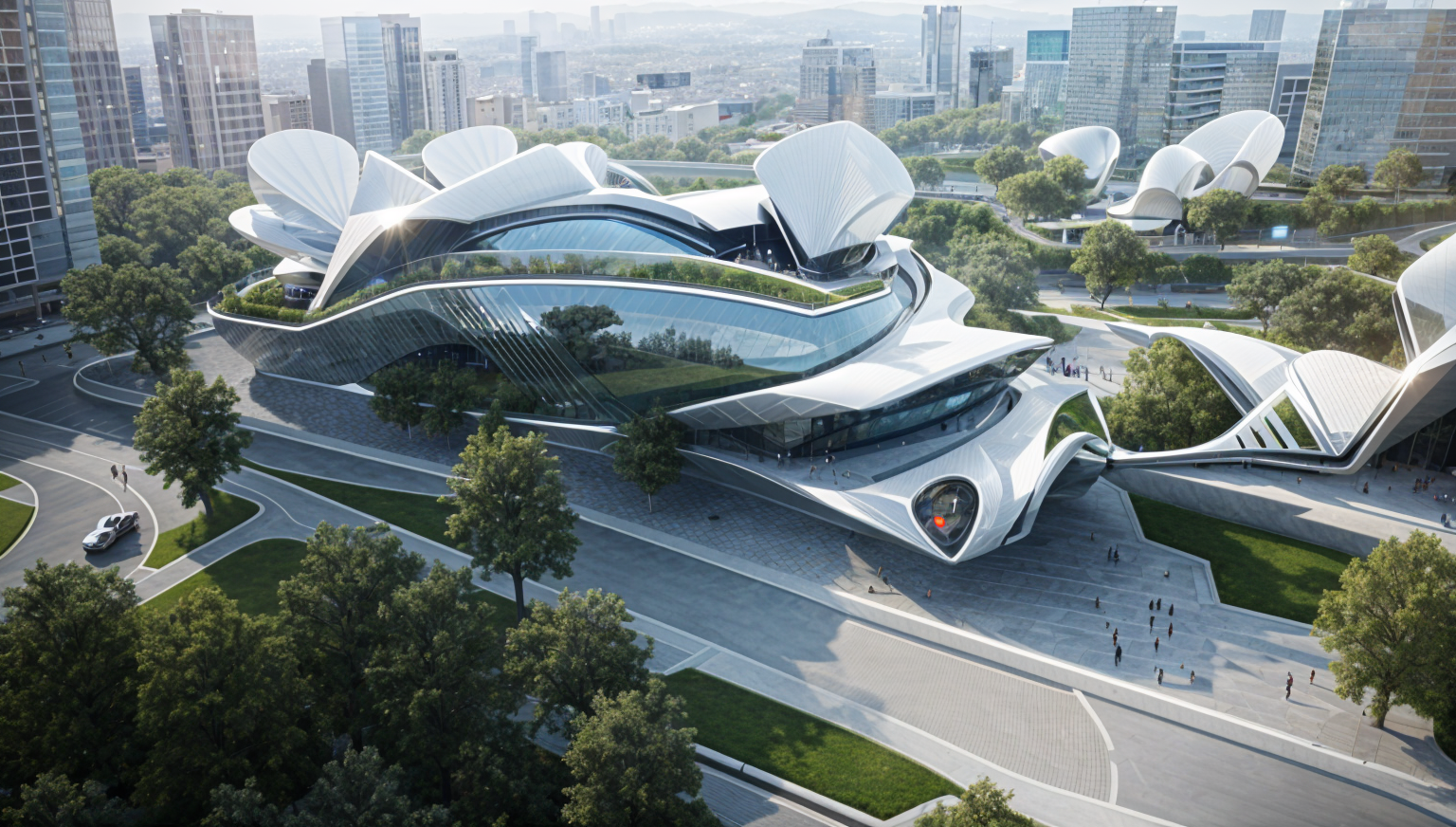 zaha hadid exterior shot as an expert in image processing i ask you to help me improve the rendering quality of an image without altering its original content or composition using restoration or resolution optimization techniques architecture
