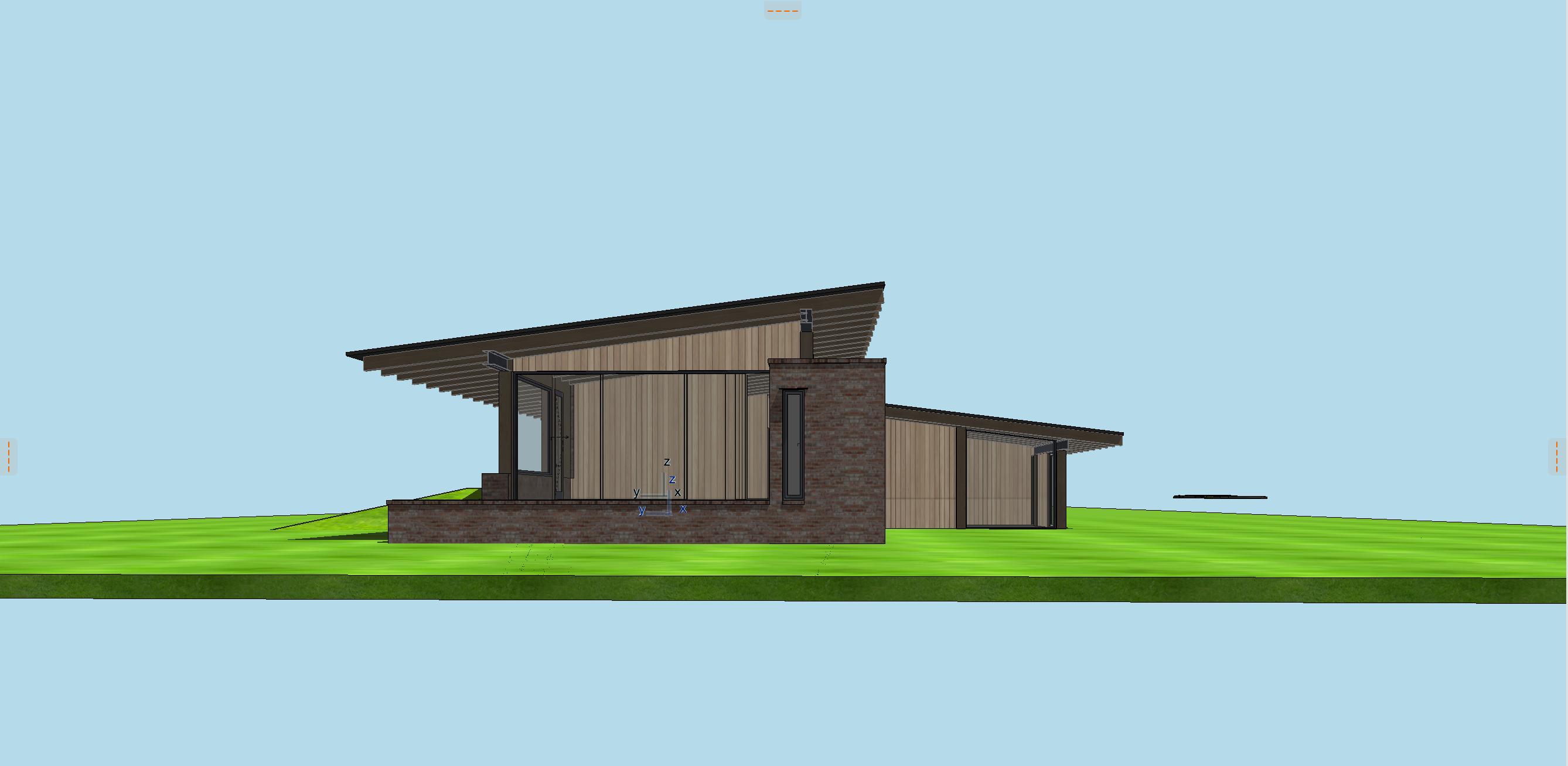 antique brick house with timber columns steel beams glass windows reclaimed pine soffit vvwild lousiana grasses and vibrant wildflowers all the way to house yellow pine trees in the background lake in the distance clouds in the sky all glass should be reflective so that in the interior of the house is not visible