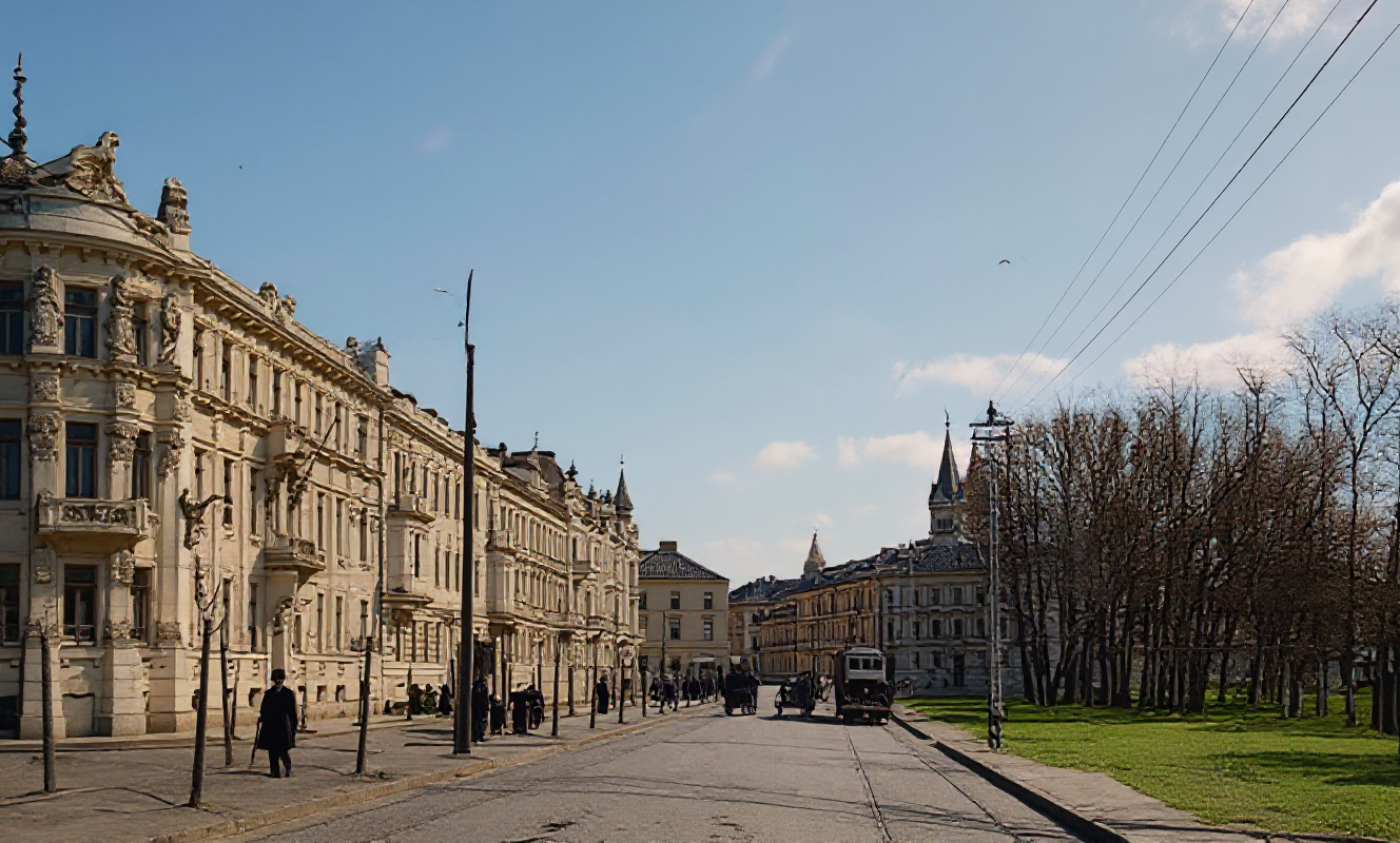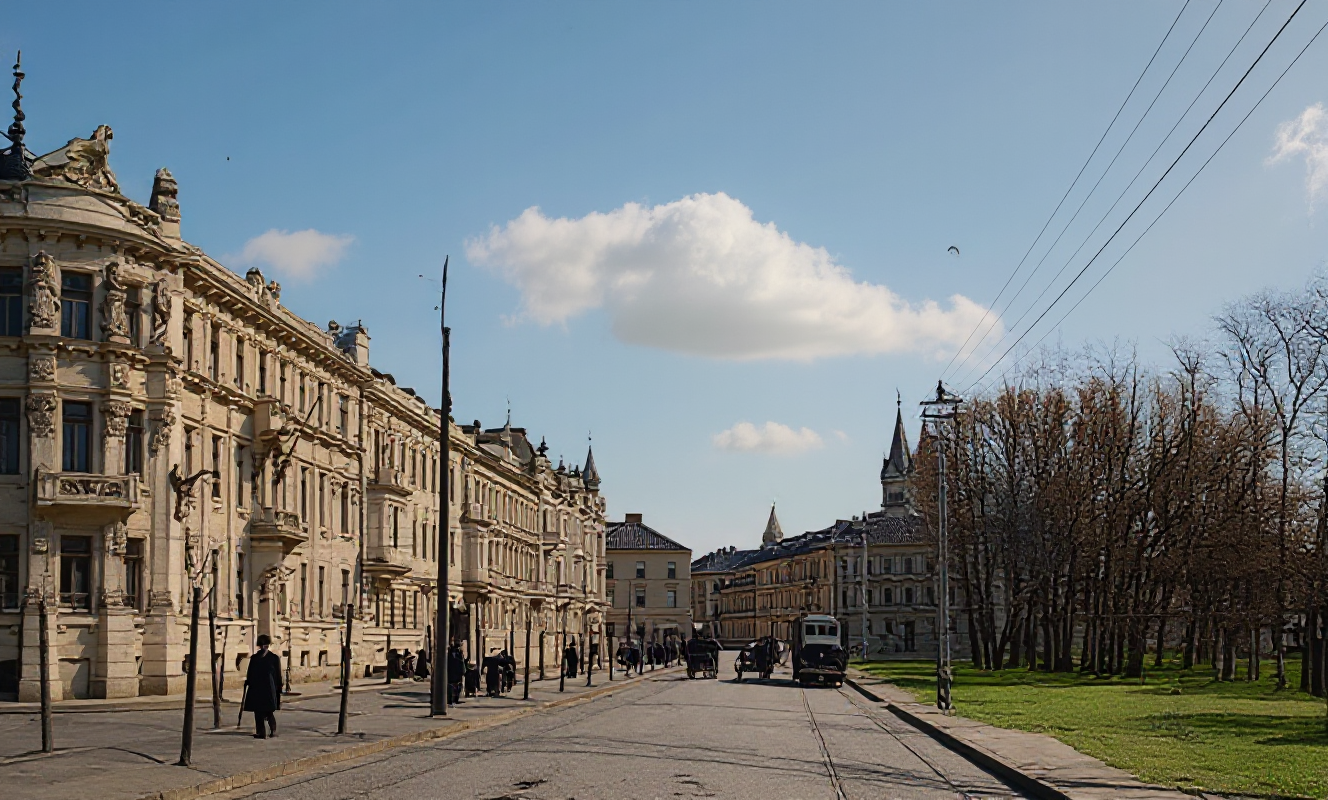 sunny day from east more hyperlight cinematic realistic color rendering beautyful clouds 1900 s style dressing people remove text from the picture paved road