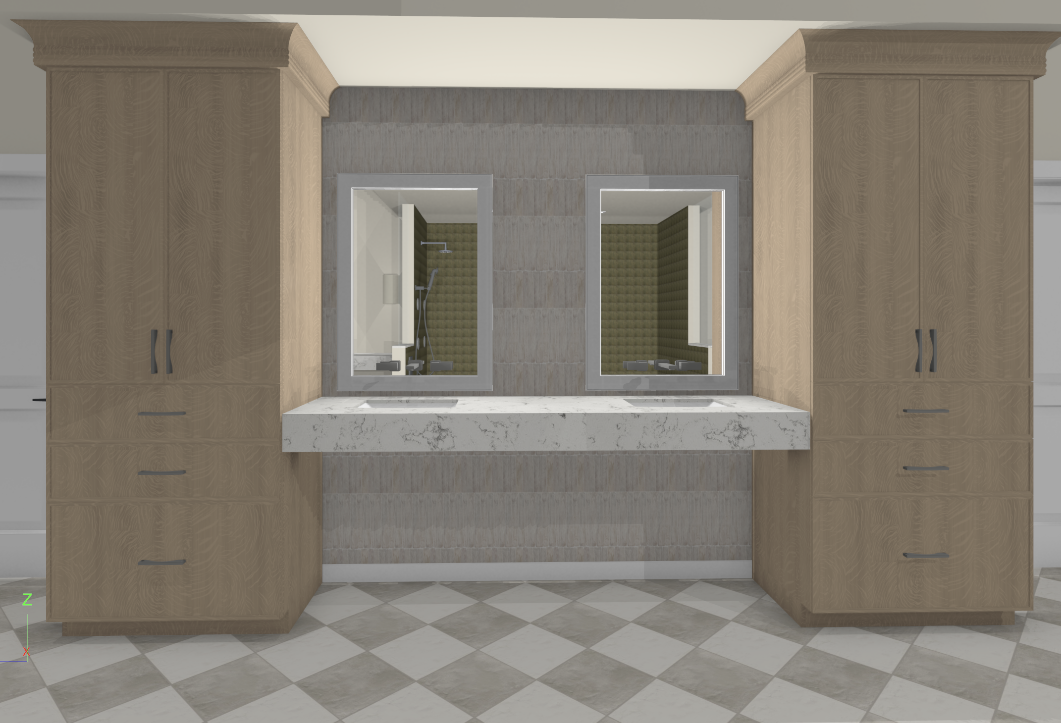 render an elegant bathroom interior with a serene atmosphere feature natural oak wood cabinets with a subtle grain pattern and matte black handles the countertop is a polished white marble with delicate gray veining behind there s a sophisticated gray stone tile backsplash in front a classic checkerboard floor in soft white and muted gray tones the lighting is warm and ambient creating a calm and inviting environment