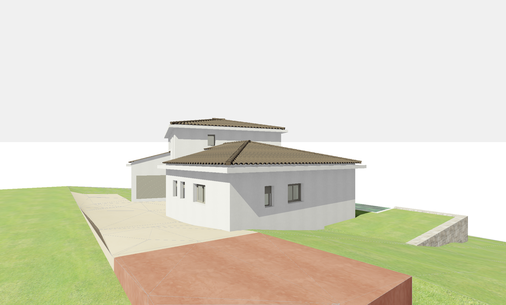mediterranean landscape in the backgound lot of light and reflects in the windows add some mediterranean pine trees and olive trees more sun on the facade