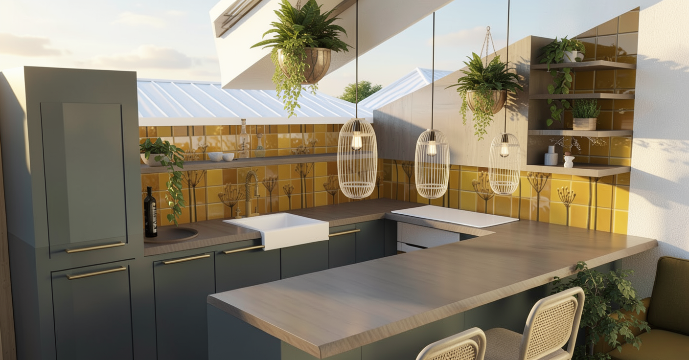 the benchtop should be 6mm thick in stainless steel dont add a back splash place a cushion on the bench to the right the light fixtures on the wall should look the same make the tiles on the kitchen island visable
