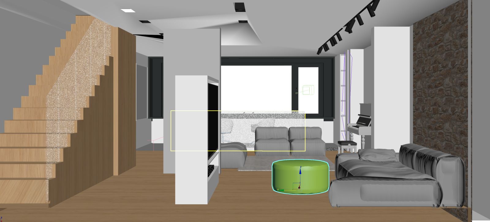 a cozy modern living room with natural lighting wooden staircase with a warm oak finish on the left leading to a minimalist second floor living area features a large comfortable gray sofa set against a soothing light gray wall adjacent is an exposed brick wall adding a rustic charm floor is a polished light brown wooden texture large windows allow daylight to flood the room creating a serene airy atmosphere a sleek white entertainment center faces the sofa and a small green pouf provides a pop of color a digital piano and stool sit in the corner emphasizing a blend of modern and classic styles overall mood is sophisticated yet welcoming
