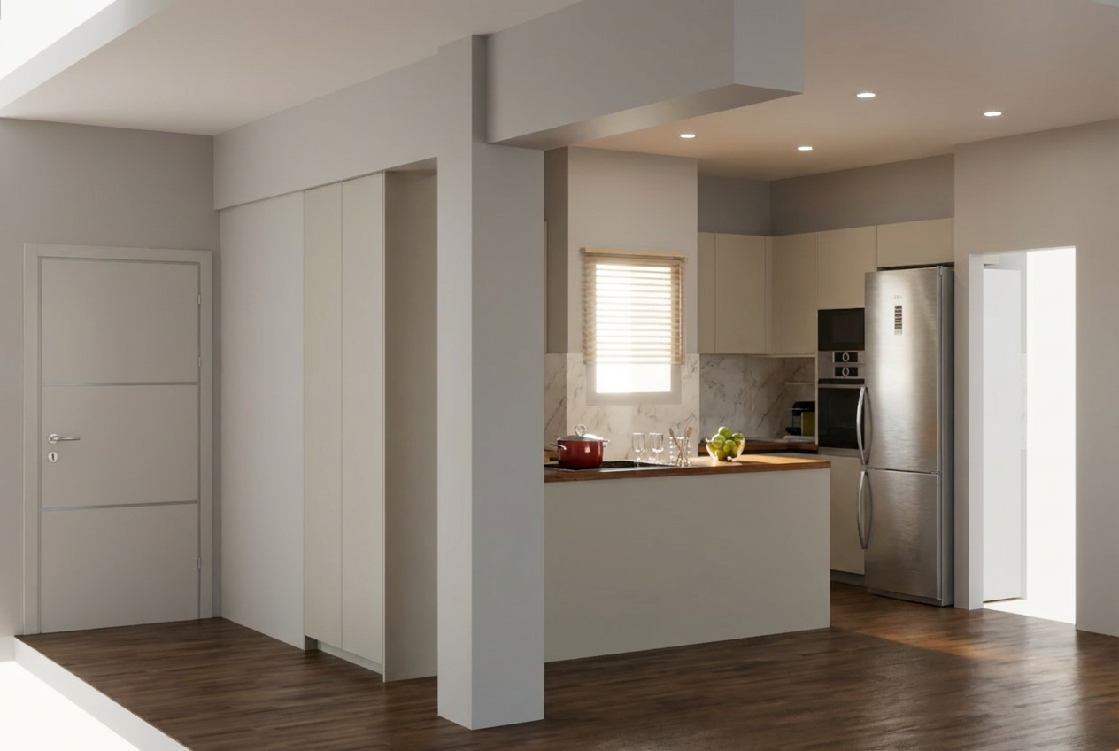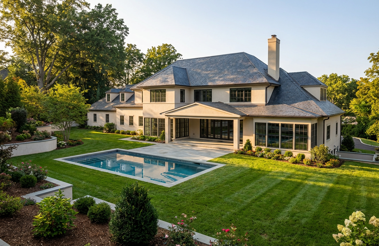 render a modern hillside house with a rustic natural design the exterior features a two story stone facade in soft gray tones with expansive glass windows reflecting the surrounding forest the upper level showcases wooden paneling in deep walnut brown complemented by a sleek black metal frame lush greenery surrounds the house with tall pine trees and vibrant ferns in varying shades of green the landscape has a gentle slope covered in golden brown grass the overall atmosphere is serene and peaceful evoking a sense of being nestled in nature makte ultrarealistic render with little bit more dull lights and a little fog