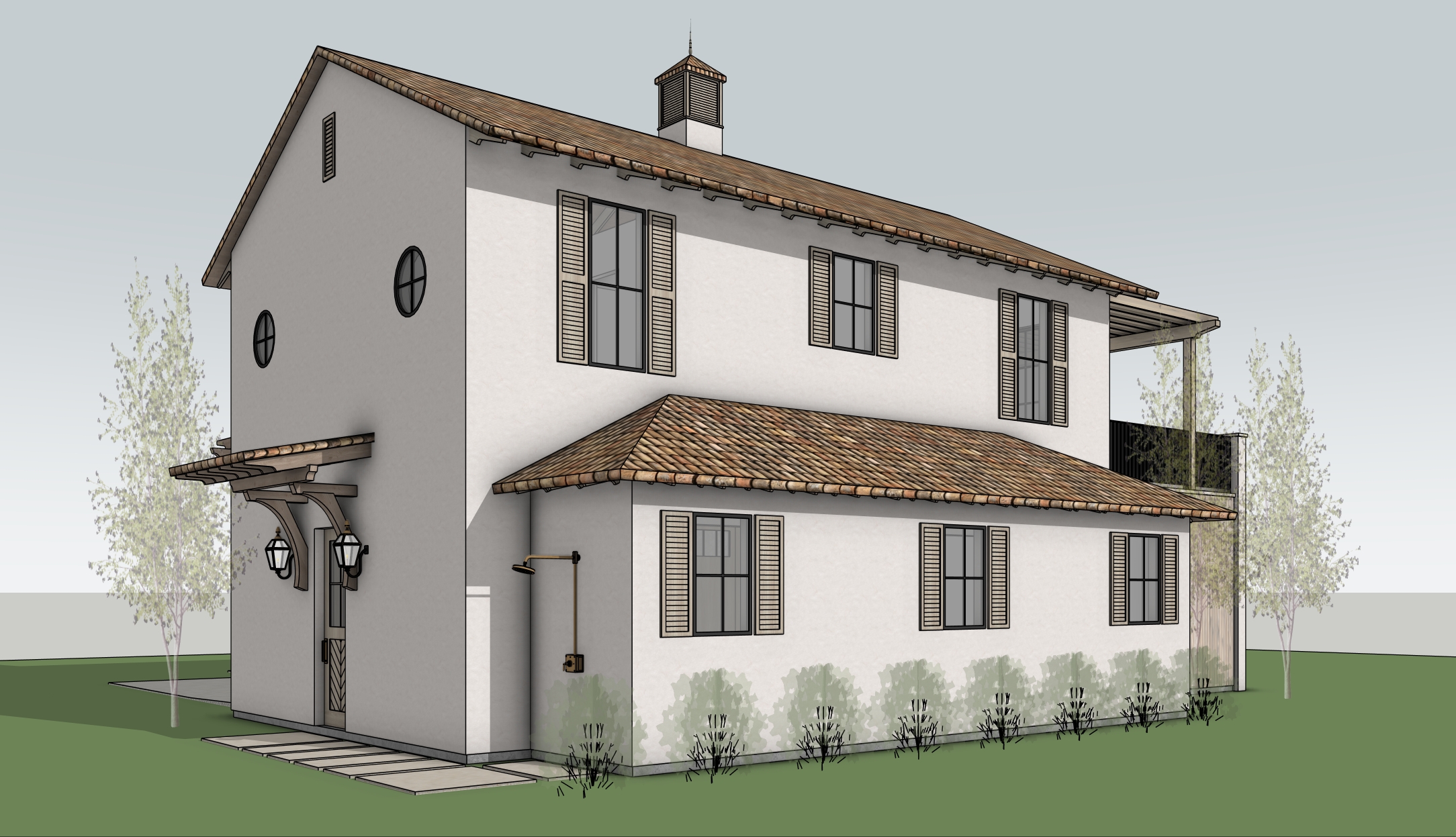 located in santa rosa beach florida on a flat lot surrounded by a forest of sand pine trees water oak trees and native foliage clear morning sky ground cover between plants in pine straw
