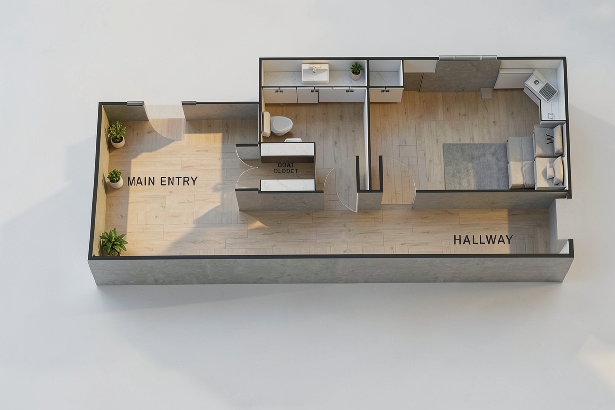 add lower cabinets and countertop all along the north wall of the laundry room replace the soft furniture in the laundry room with a top loader washing machine and a dryer next to it do not change anything else