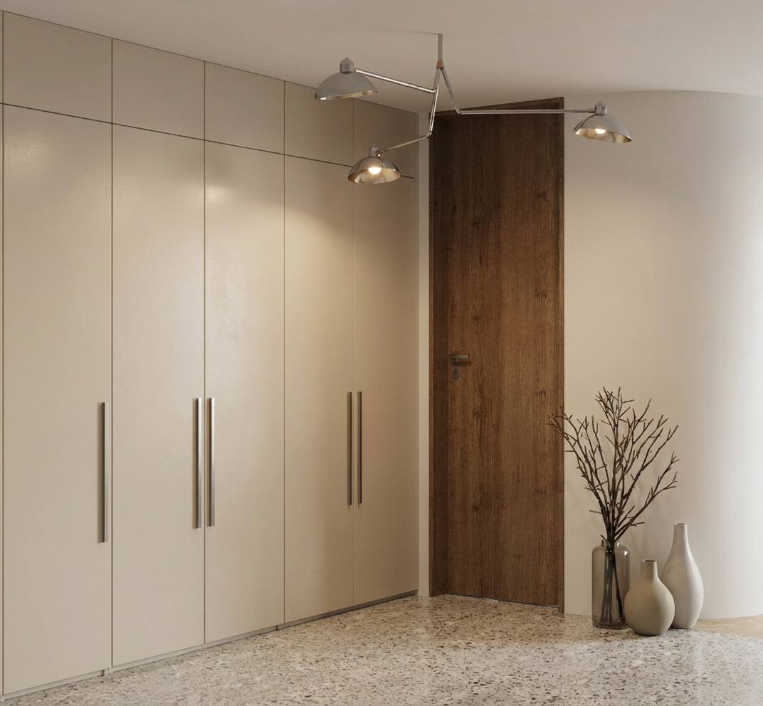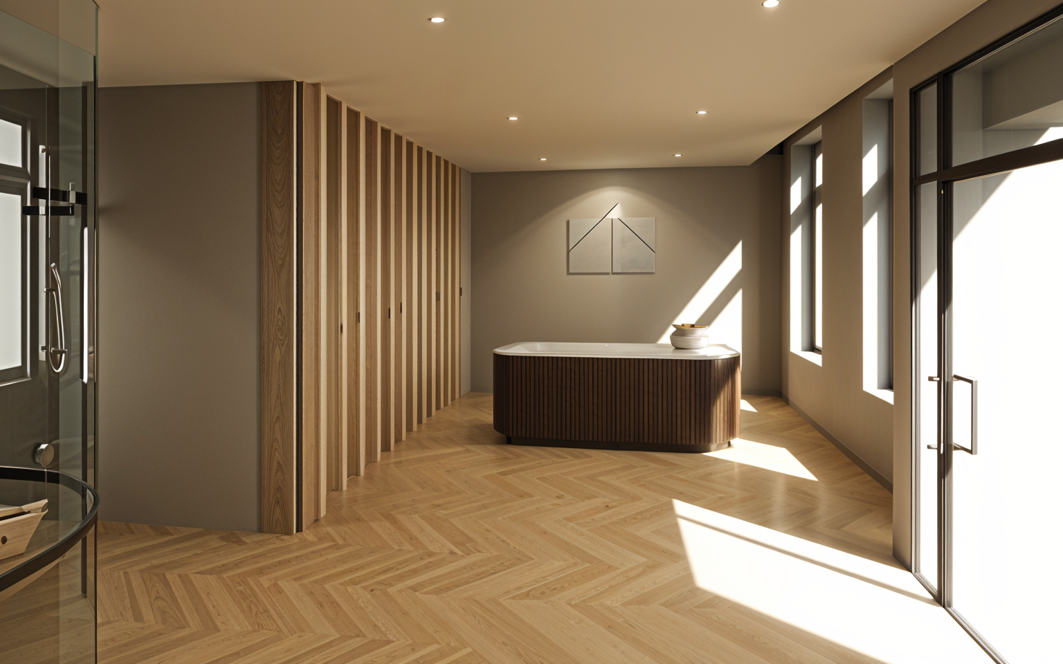 change the shower tile in the reflection to a warm neutral beige keep everything else about the scene the exact same as the original
