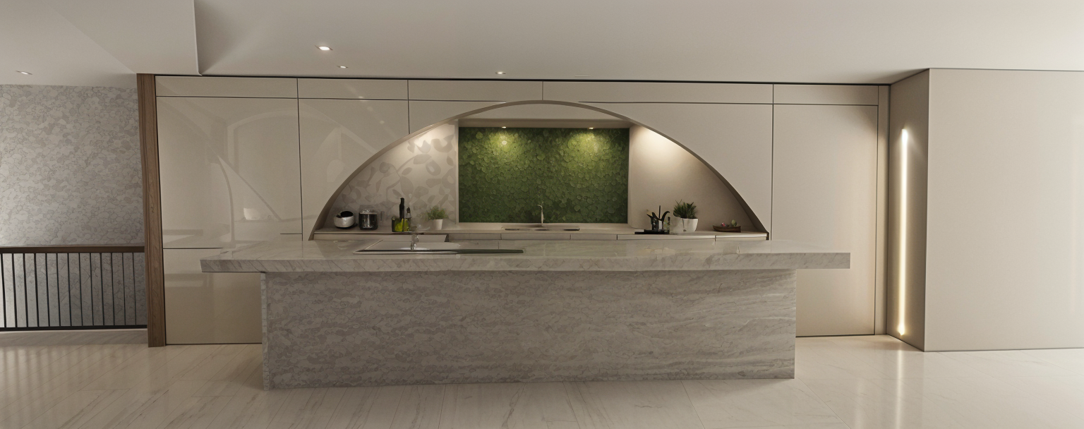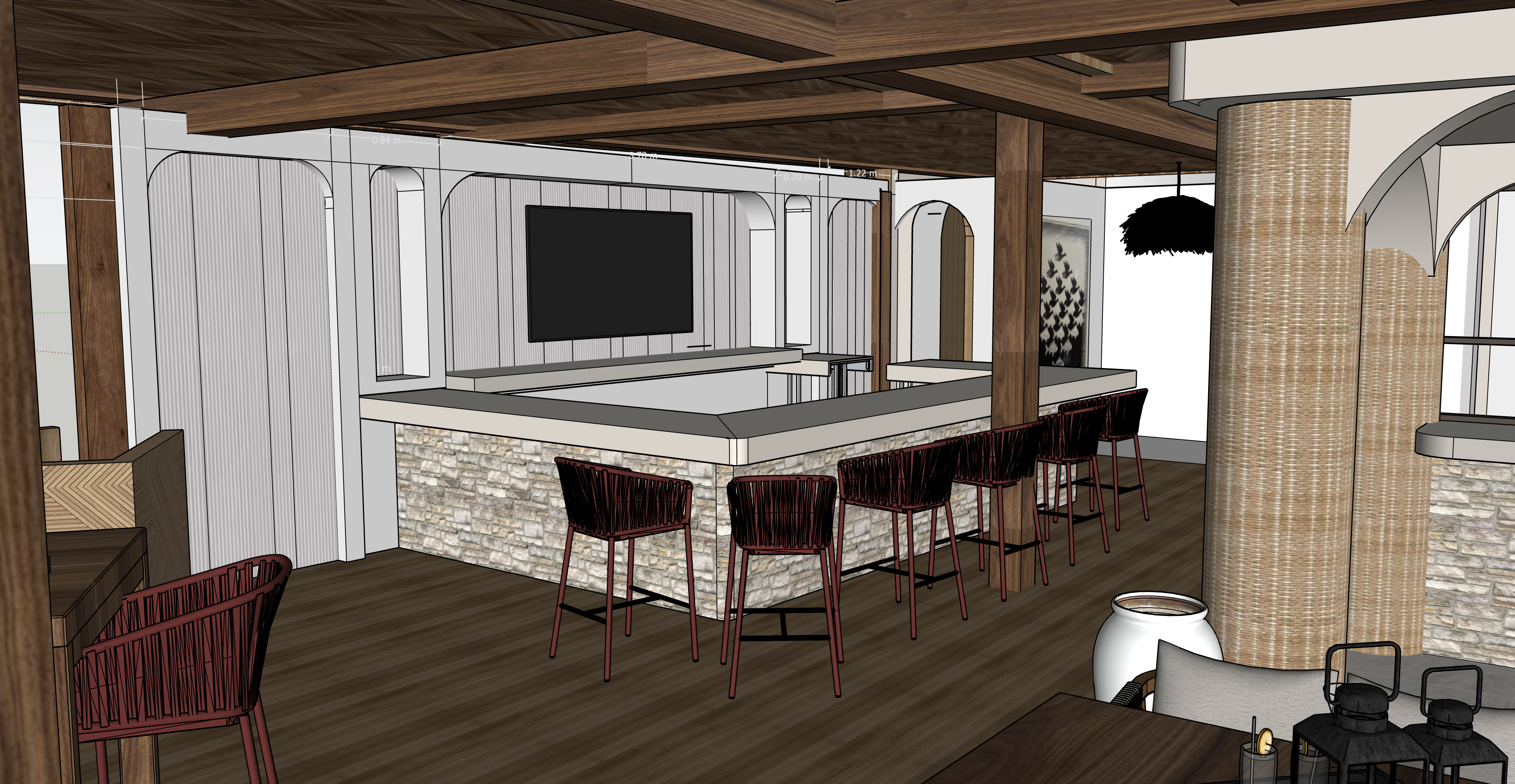 restaurant interior curved stone bar with indirect lighting wooden floor backdrops in aged mirror and indirect lighting bottle displays and olive color bar stools