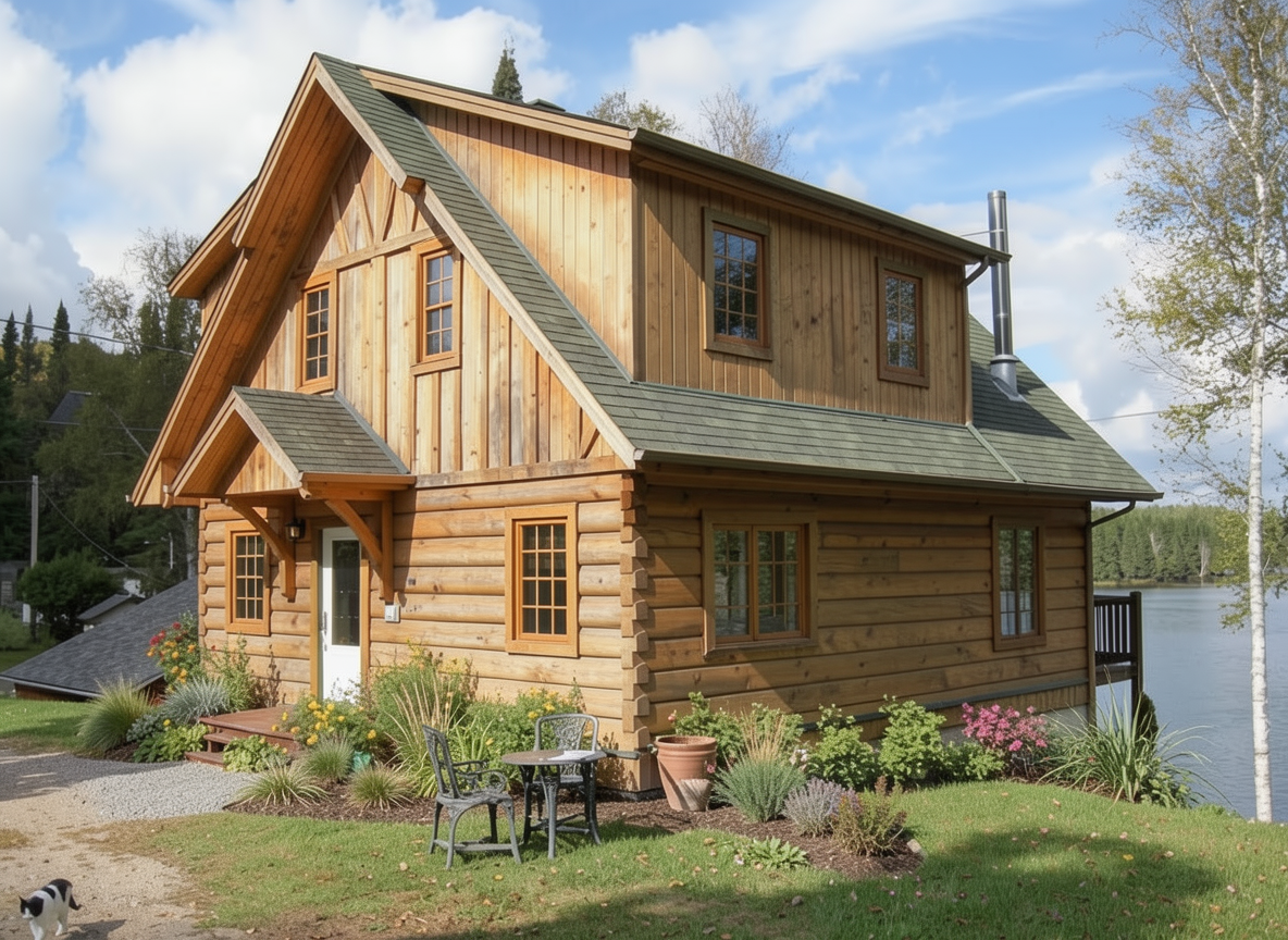 enhance this beautiful log home photo add a little bit more natural landscaping in a natural muskoka lakes environment also update the colour scheme for something as more trending right
