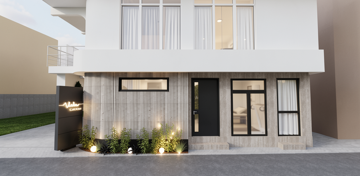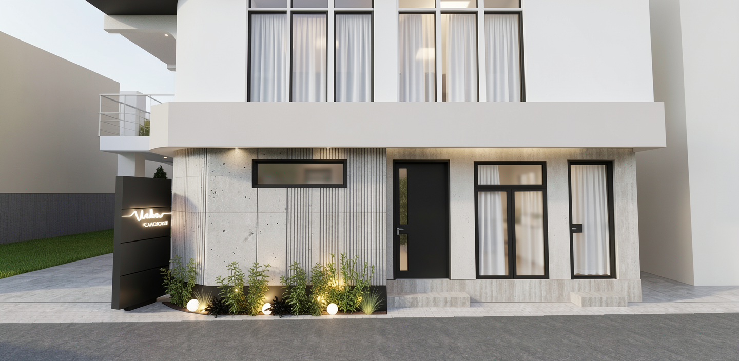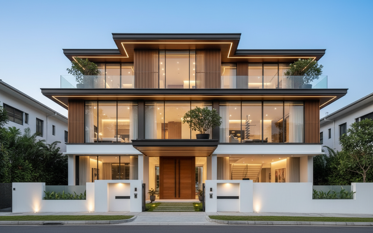 transform this daytime architectural elevation into a stunning night scene keep the building and all architectural details exactly the same emphasize extraordinary cinematic lighting and atmosphere warm interior lights glowing through windows subtle exterior accent lighting highlighting textures soft ambient reflections and moody night sky with stars add a sense of depth elegance and serenity suitable for a high end architectural design book cover avoid changing the structure materials or perspective of the building