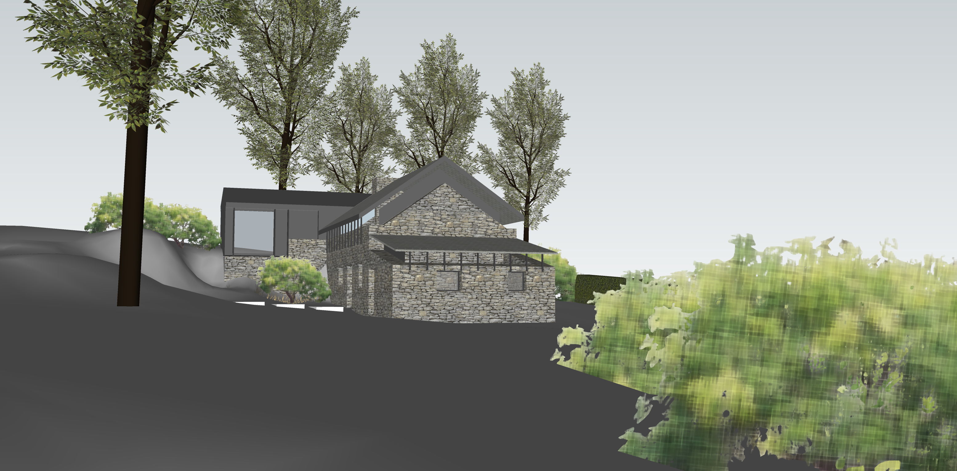 create a serene atmospheric perspective image with soft diffused lighting and minimal reflection the image shows an external view of a modern conversion of a small welsh cottage the building retains the original welsh stone walls with a new welsh slate roof raised above the existing walls there is a new dark timber clad side extension with large picture window with reflection of cadir idris on the glass the cottage is cut into an overgrown steep rocky hillside directly behind the house is a steep wooded hillside with lots of dense vegetation and trees the conversion is contemporary in style complimenting the original rustic stone walls of the cottage the quality of the image is ethereal with soft lighting and slight haze and the image looks similar to visuals by forbes massie