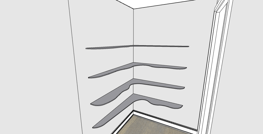 enhance this scene to a realistic interior render while keeping all architectural elements shelf shapes dimensions wall intersections layout and camera angle exactly the same do not change the geometry the walls are a soft gray the floor is gray toned wood parquet taco with subtle natural variation the door is gray lacquered with classic boiserie detailing keep all these finishes exactly as described without altering their color or design only add subtle decorative objects on the shelves ceramic vases art books placed horizontally and vertically sculptural stone pieces minimalist bowls a natural wood accent object and one small plant the styling should be minimal calm and not overcrowded use a neutral palette white beige bone charcoal matte finishes use soft natural daylight realistic shadows refined global illumination subtle surface textures and photographic lighting no dramatic color grading or glossy effects aim for high end interior realism and an elegant serene mood