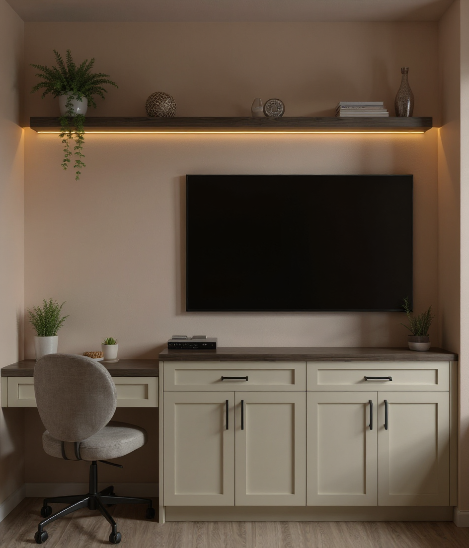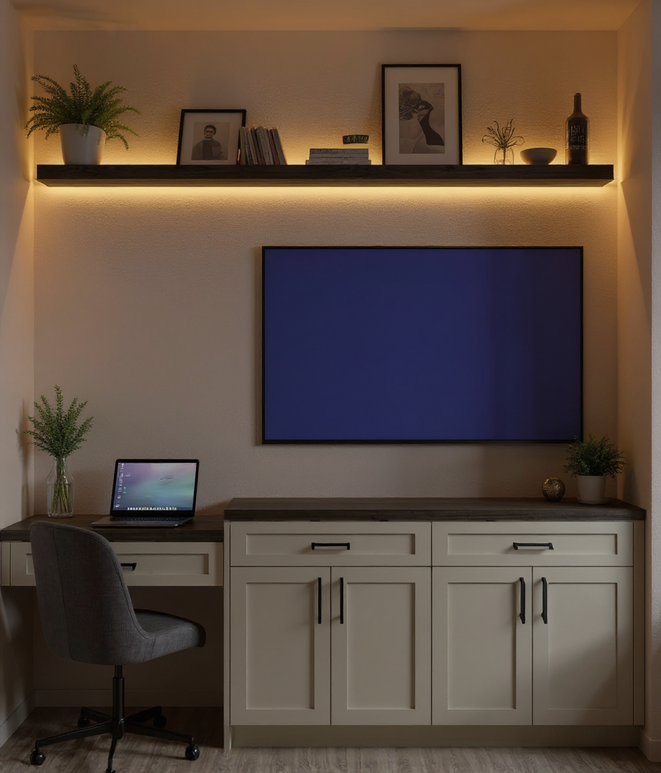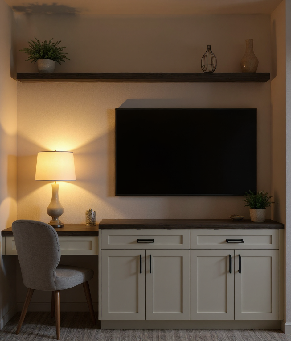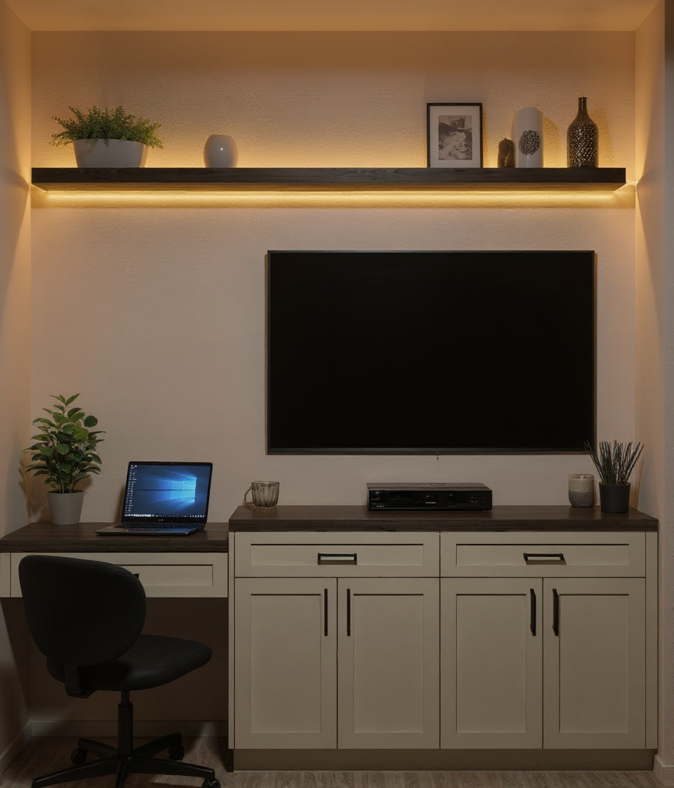 add some decorations add tv add chair at desk remove lights at shelf add laptop at desk area