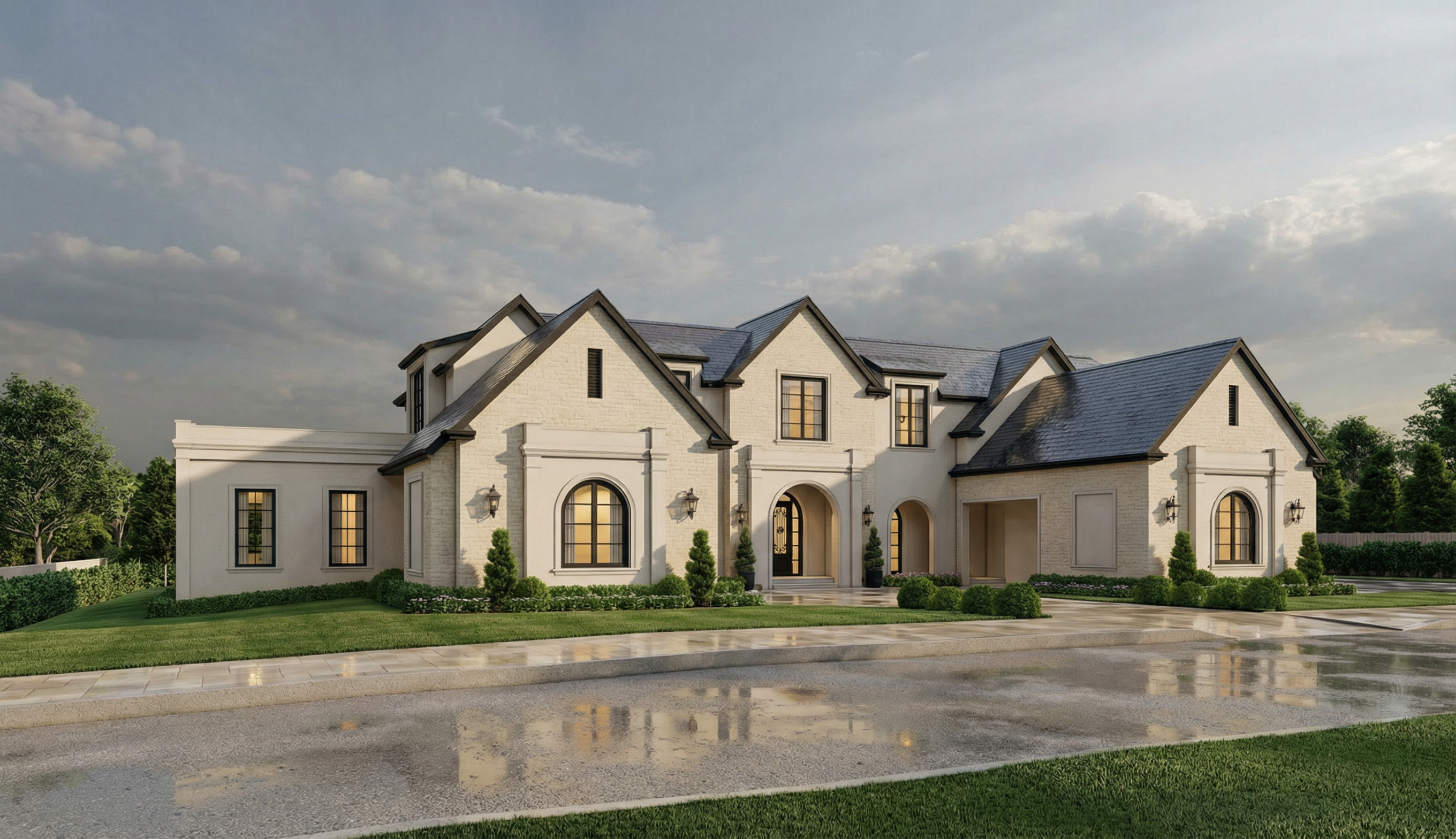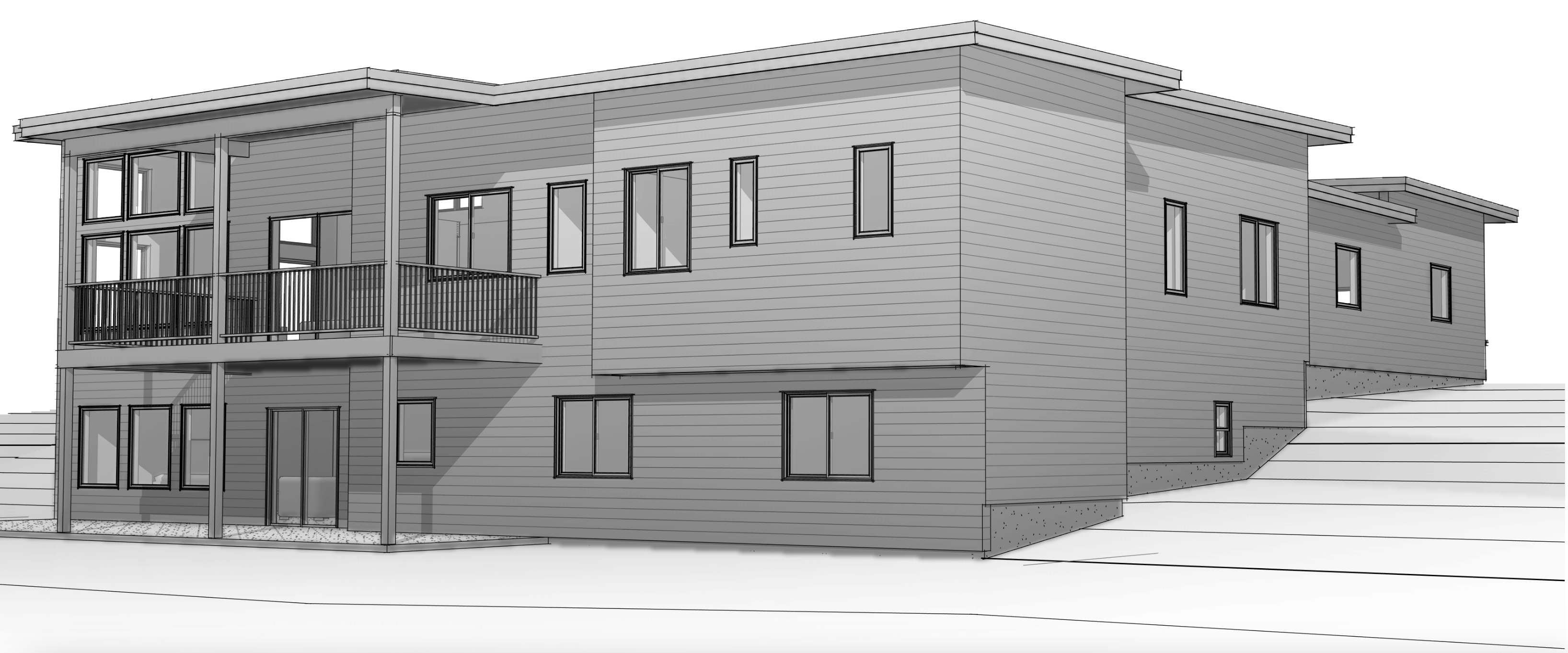 render with white lap siding everywhere black roof and fascia black windows deck timbers stained dark brown
