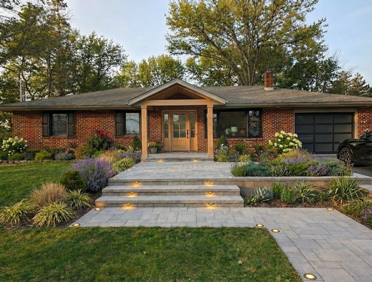 remove sidelites from door but keep the door the same as the photo and make the brick of the house a mix of warm white and cold white bricks and make the sidewalk stones a more warm grey