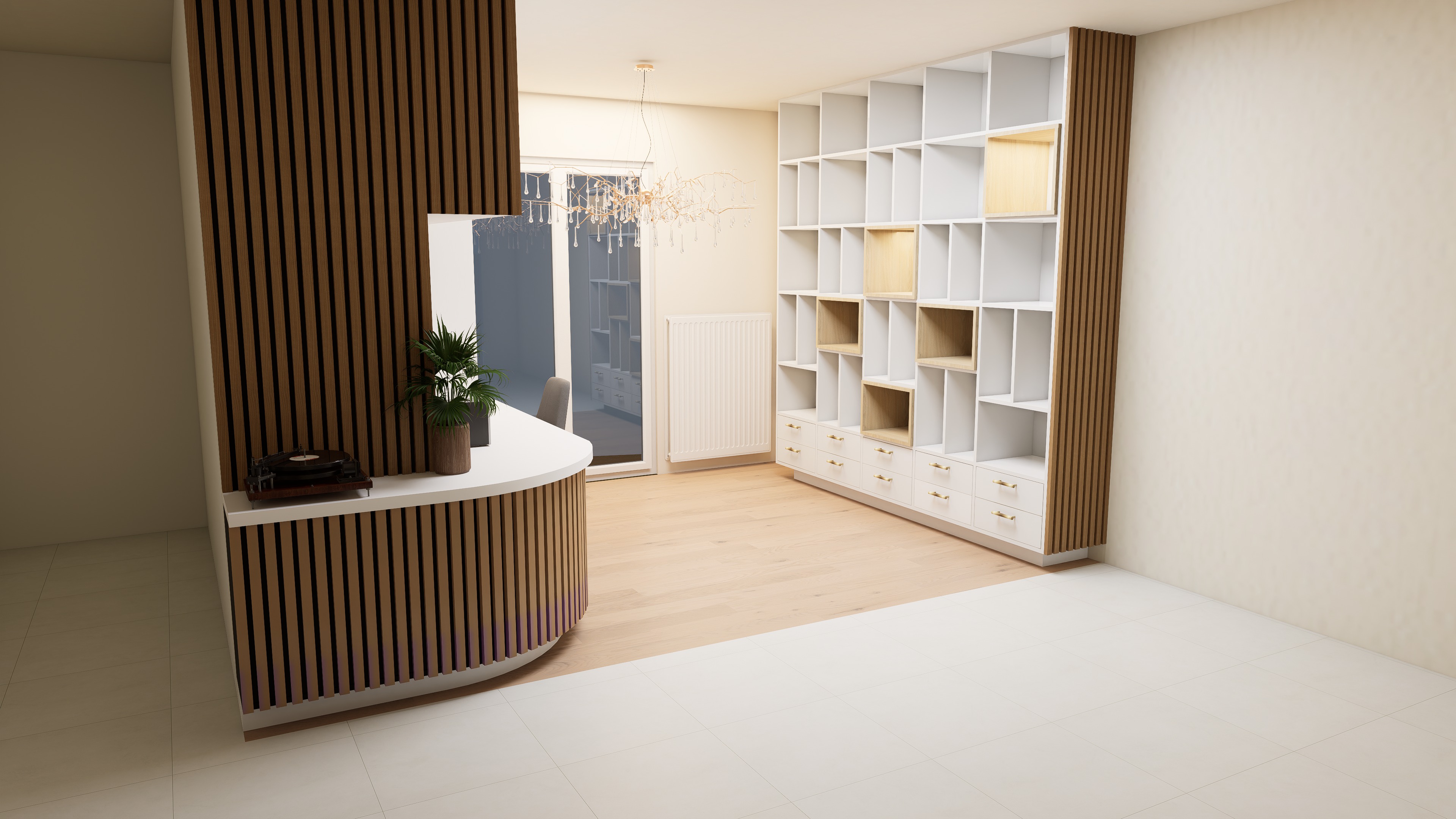 rend cette scene realiste ajoute un poele a bois a droite de la biblioth que rempli la biblioth que de livre vase et autre l ment ajoute de belle led dans chaque niche en ch ne da la biblioth que pour les faires ressortir et cr e une ambiance la fenetre je souhaite voir a travers et voir derri re une all e en enrob avec un jardin derri re ne modifie pas les couleurs ou les textures rend les seulement r aliste
