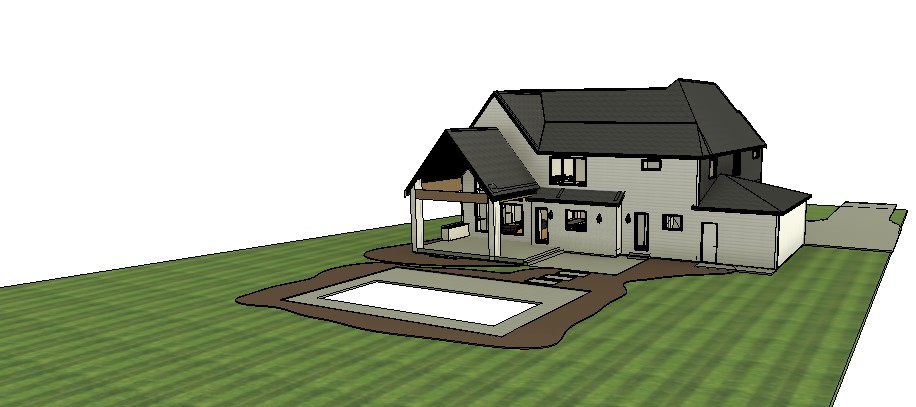 exterior rendering add pool w white lap siding and black asphalt shingle roof wood tone beams on porch