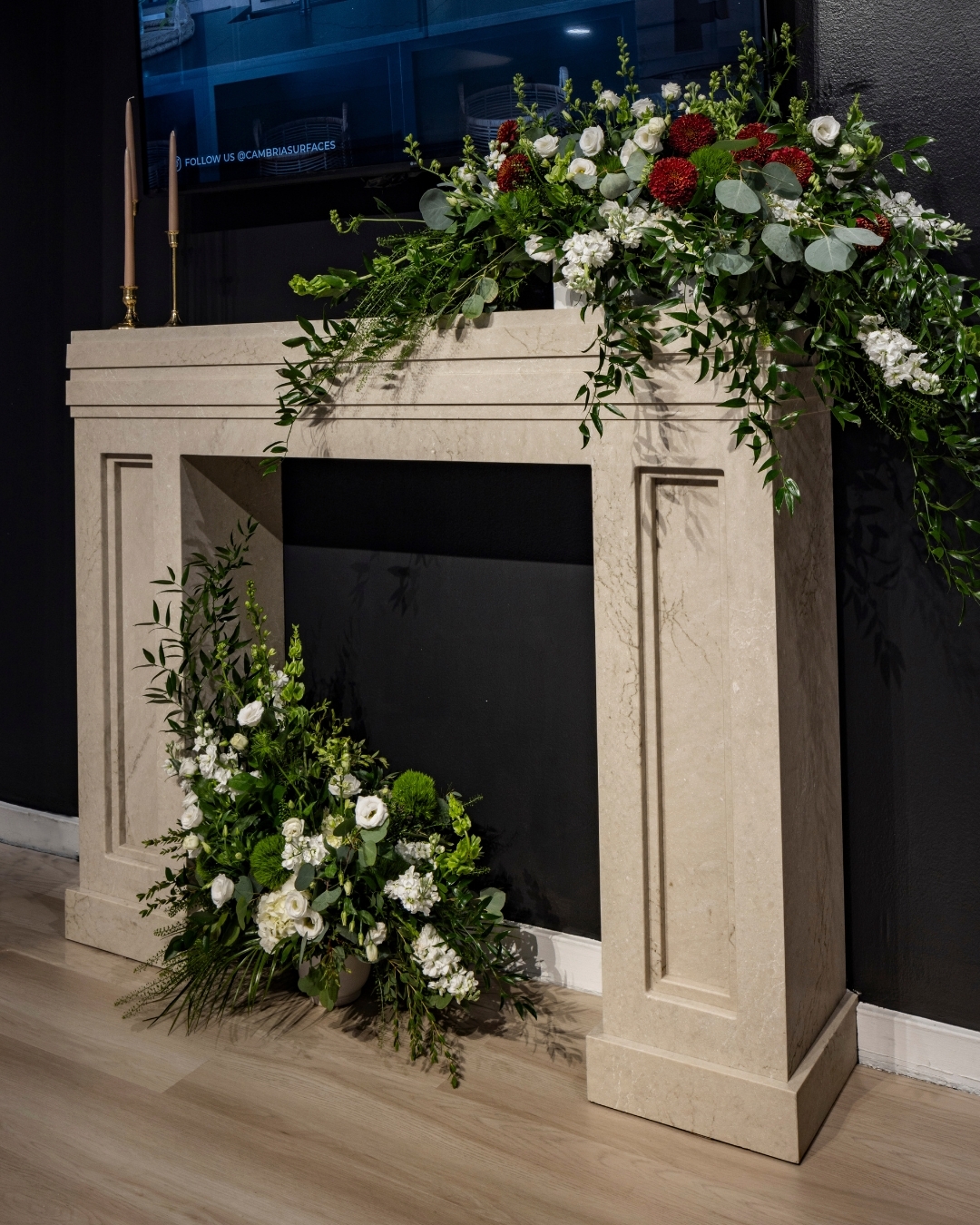 remove the florals and background and change the setting to a luxury living room that is minimalistic white tonal earth around the fireplace do not change the way the stone looks