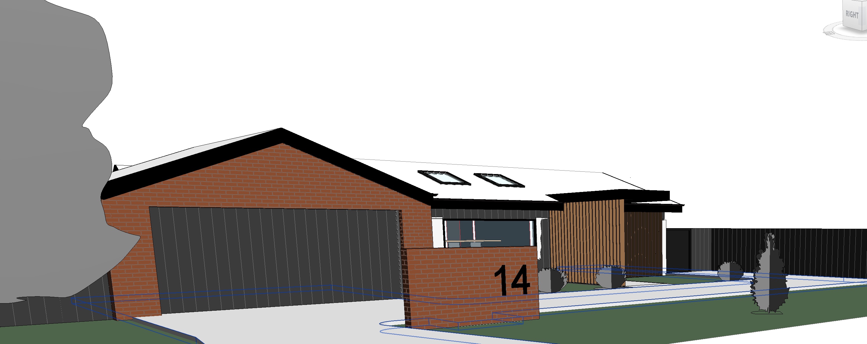 sunny day photo realistic render reclaimed redbrick white render black metal cladding white metal roof with black facia and gutter