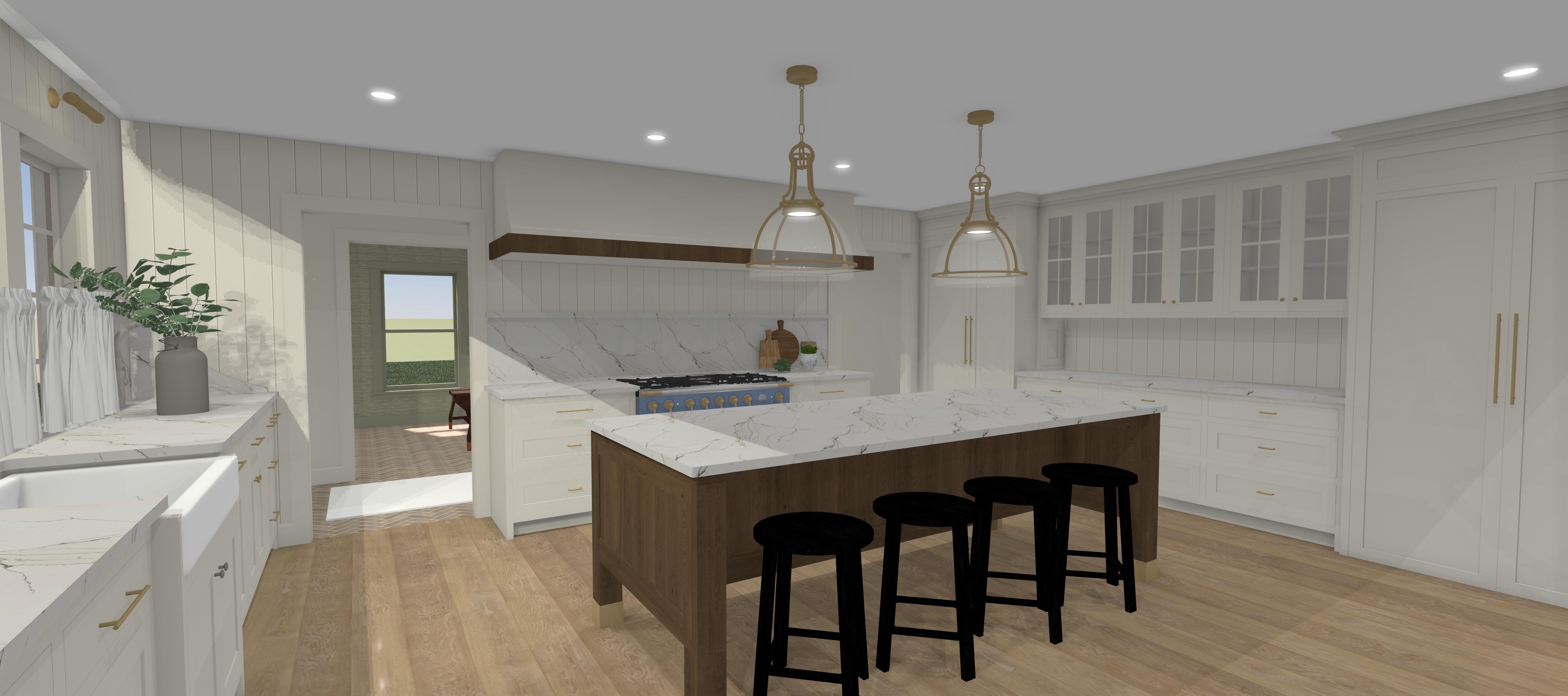 create a realistic rendering with dramatic natural light streaming through the window with the ceiling lights on very low stage with kitchen with a small bouquet of flowers on the island and a mug of coffee