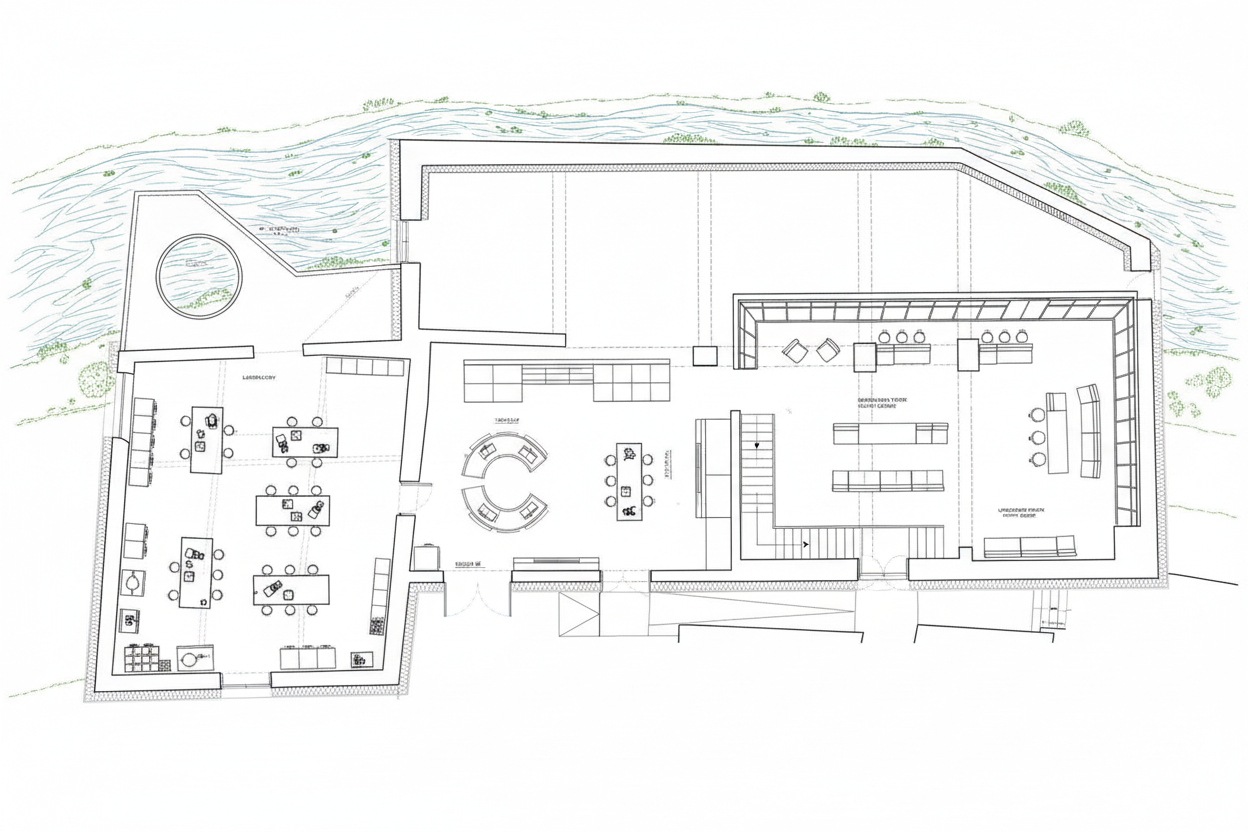 exterior shot make this into an ecological and environmental hub with a terrace off the small rectangular building that overlooks the river and has a cut out to look over the river below the larger room is divided in two the lower half with the two openings on one wall is a museum display area describing the local wildlife the other half at the top by the deck is sunken below ground with windows that look into the river underground and watch it flow by place furniture facing the windows for people to sit and view the water and animals inhabiting it finally in the small rectangle building make a labratory space for dissecting and discovering the environments intricacies make all of these furnishing black and white and autocad style design as an architectural plan uses these descriptions to make an architectural plan layout of the space make this an autocad plan not an imagery collage again make translate this into autocad plan make the river flow on the other side of the building and place the windows looking out to the river put the river overlook on an addition terrace built off the back of the small rechtangle building keep the river flow exactly like this extend the overlook terrace over the river further and have a cut out to look down into the water make the furniture more interesting and intentionally placed get rid of the bump out displays and put them inside the building i love it put the sunken portion of the building and the furniture and windows closer to the water fill out the rest of the space make the space where the stairs are now an exhibition architecture