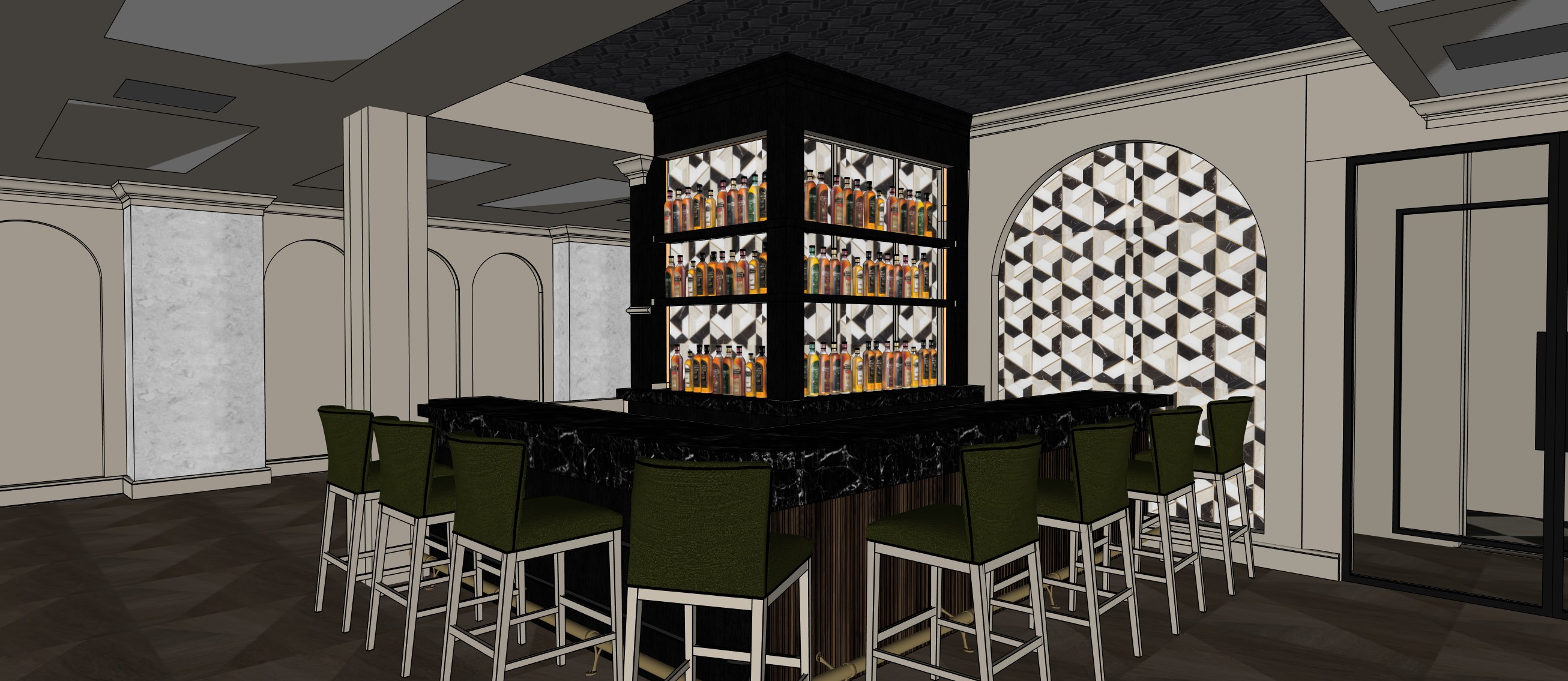 modern art deco style lounge bar with back lighting and warm colors
