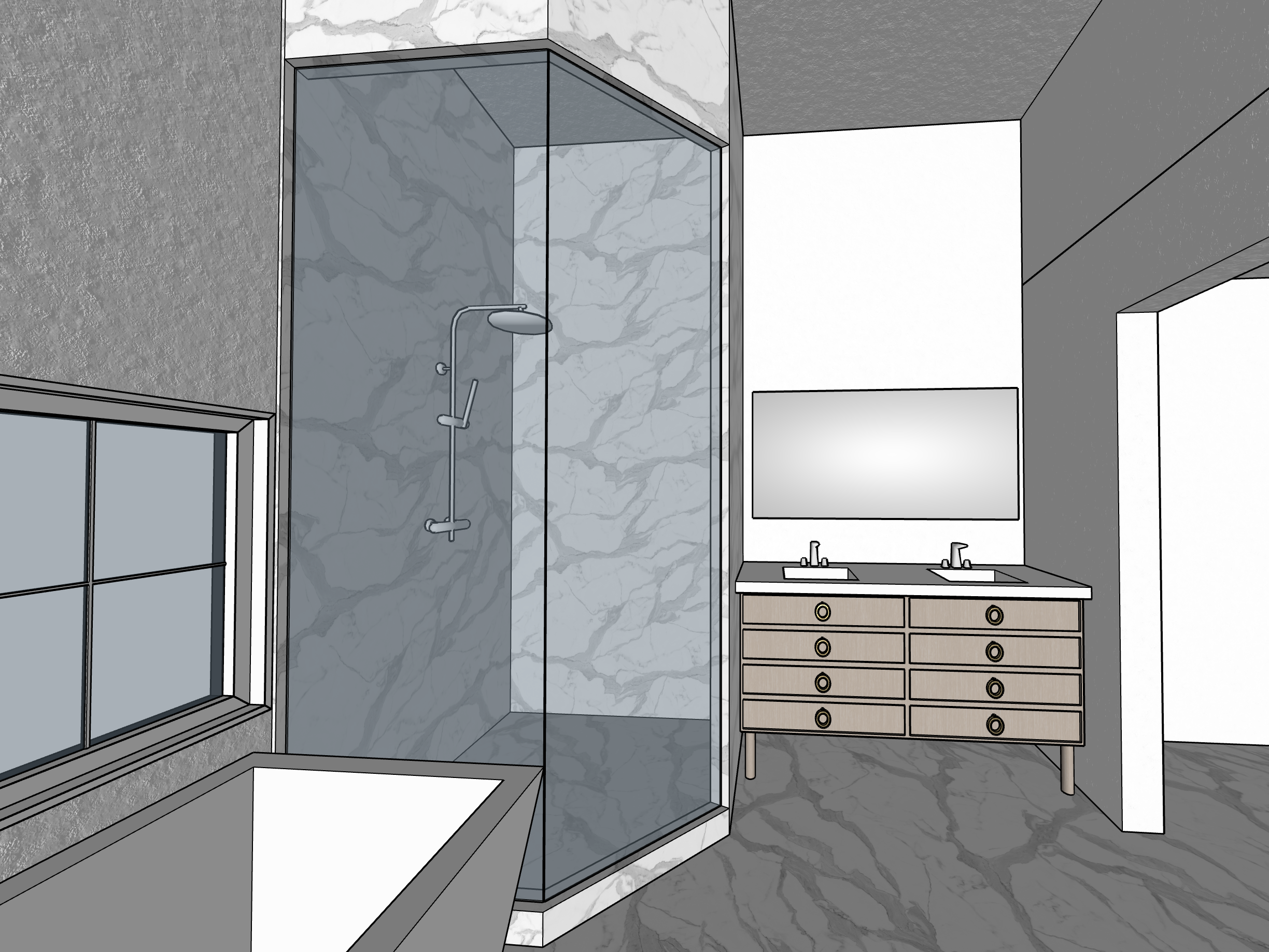 a luxurious modern bathroom with a serene and elegant atmosphere the walls are painted in soft white tones complemented by white trims and edges the floor is a sophisticated marble with a mix of light and dark gray veins that reflects light with subtle sheen the double vanity is crafted from light wood with brass drawer handles topped with a pristine white countertop the large frameless mirror above reflects ambient light enhancing the room s spacious feel natural light to flow in creating a bright and airy atmosphere all hardware is brass nice weather outside trees seen in bokeh fully lit natural lighting