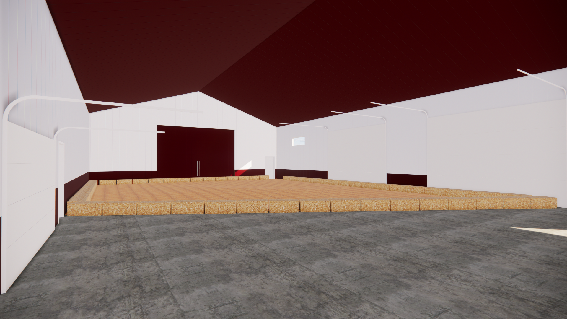 add kids playing in the corn kernel pit beyond the haybales making render more photorealistic walls are standing seam metal panels add wood trusses to go along roof line keep all walls garage doors doors in place add tables with bench seating with people sitting at them on the concrete floor area only