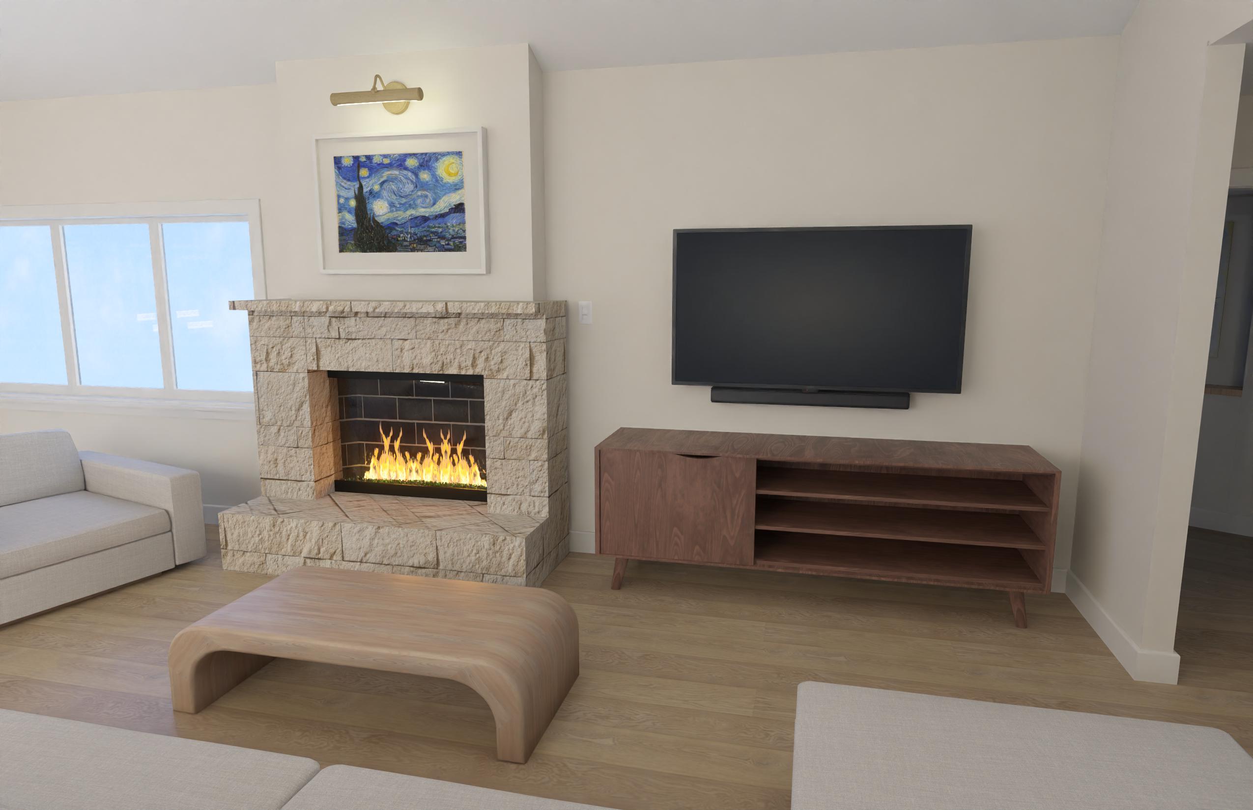 create a beautifully rendered calm living room scene with a stone fireplace the painting above the mantel should be of a serene nature painting with a large frame keep the tv off and all decor elements natural neutral and soothing including small plants books candles and vases the overall mood is soothing yet lively with an emphasis on rich natural tones change the painting to a calm nature painting