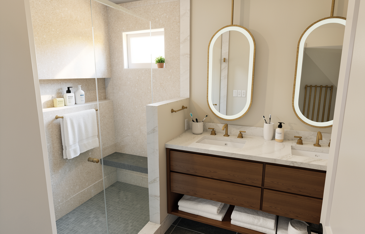 enhance realism sunny warm summer lighting no bloom turn on lighting inside cabinet shelves fill blank background with trees and los angeles style houses metal bedside tables with beige doors preserve all design materials colors and composition do not change anything