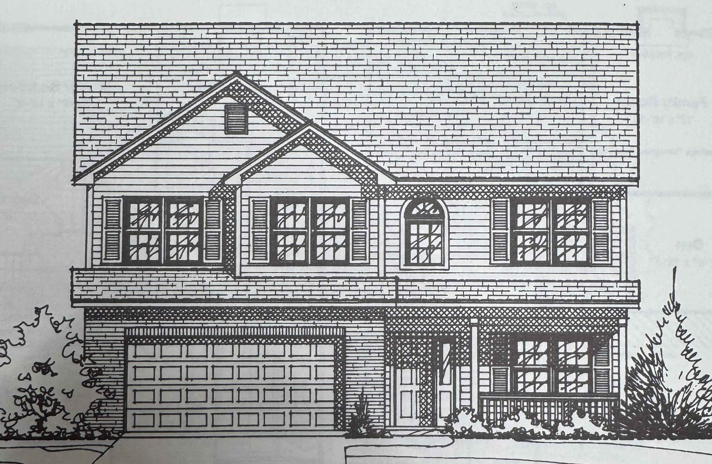 light gray brick light gray siding stained wood garage door and porch details