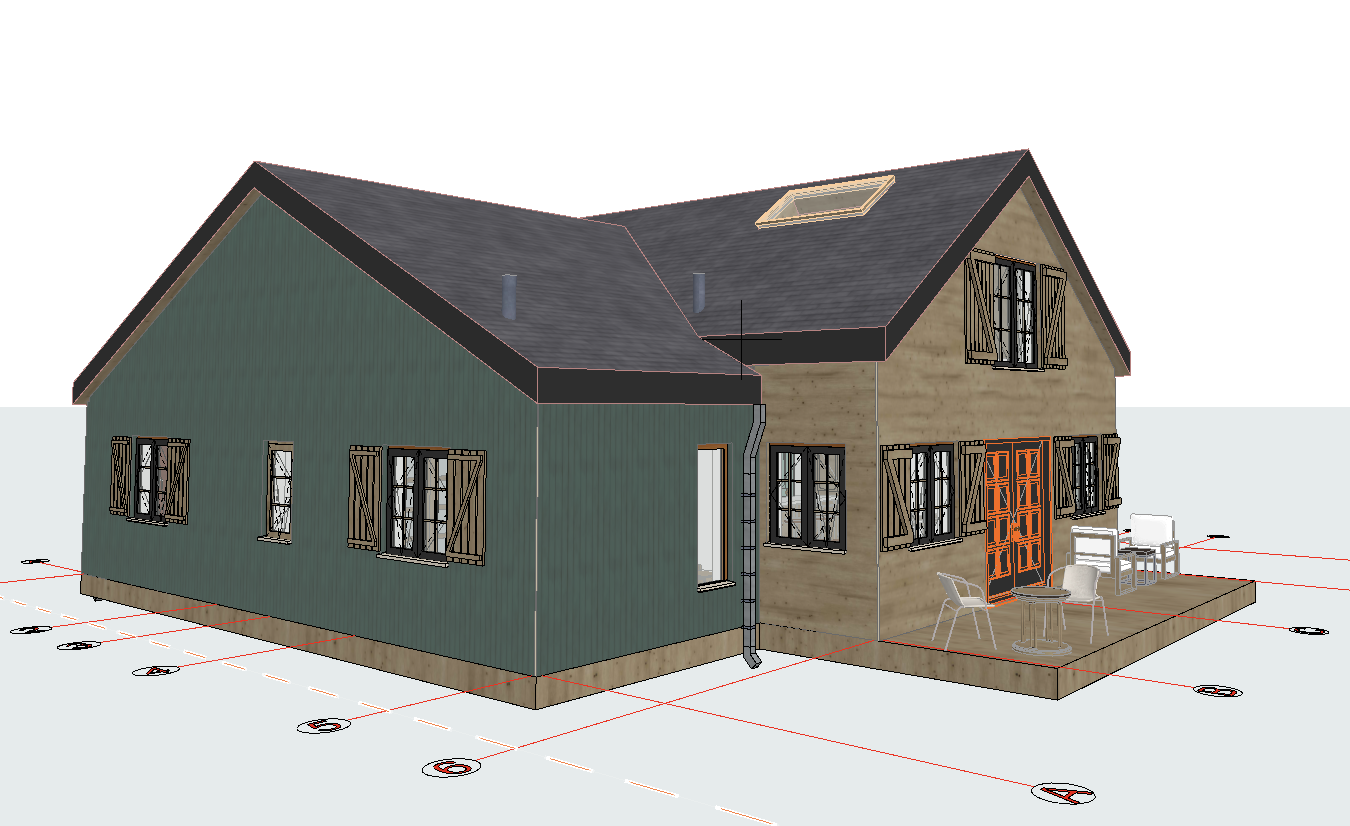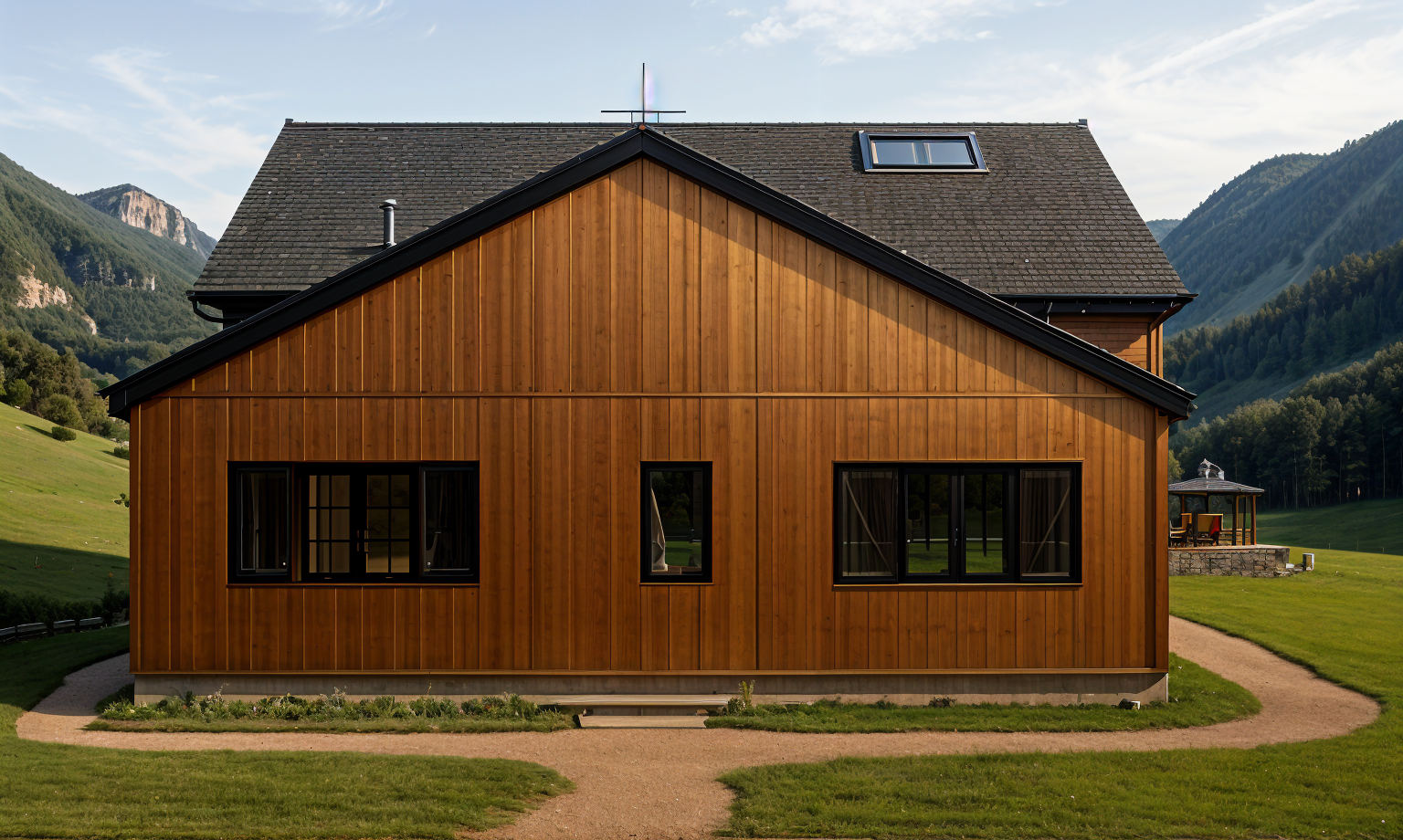 new traditional roof design green walls in green copper metal brown wall in vertical clear wood green landscape small mountains black window shutters skylight bigger