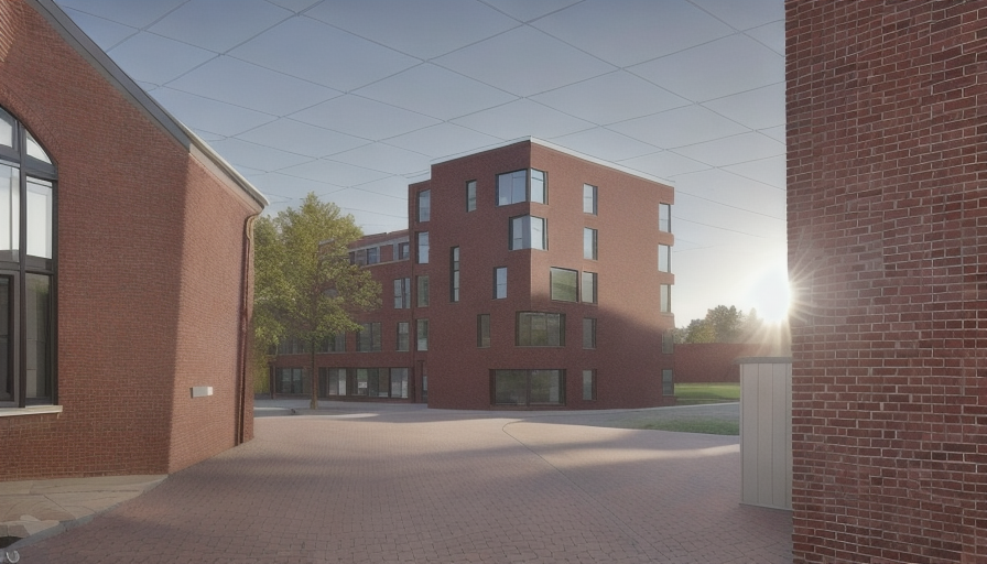 please use a dark red brick facade the rear part of the building with a gray plaster facade and please leave the surrounding area gray and not change it it should be a summer day the sun should shine and the road should be paved architecture