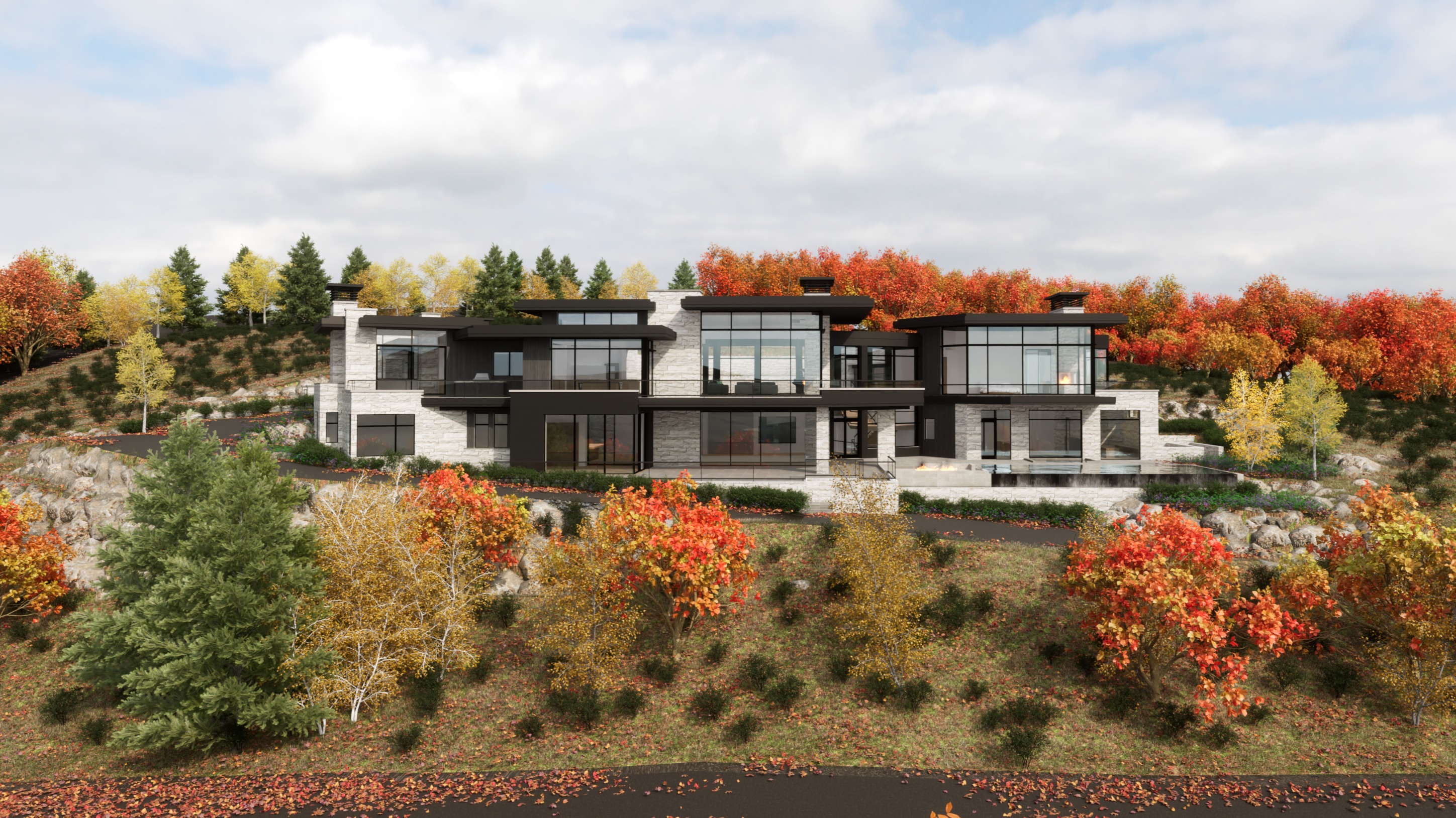 don t change the structure enhance the lighting shadows and materials to feel more natural and realistic i want the environment to be autumn with the vegetation changing to autumn colors change the landscaping so the plants look more realistic change the sky to match the environment
