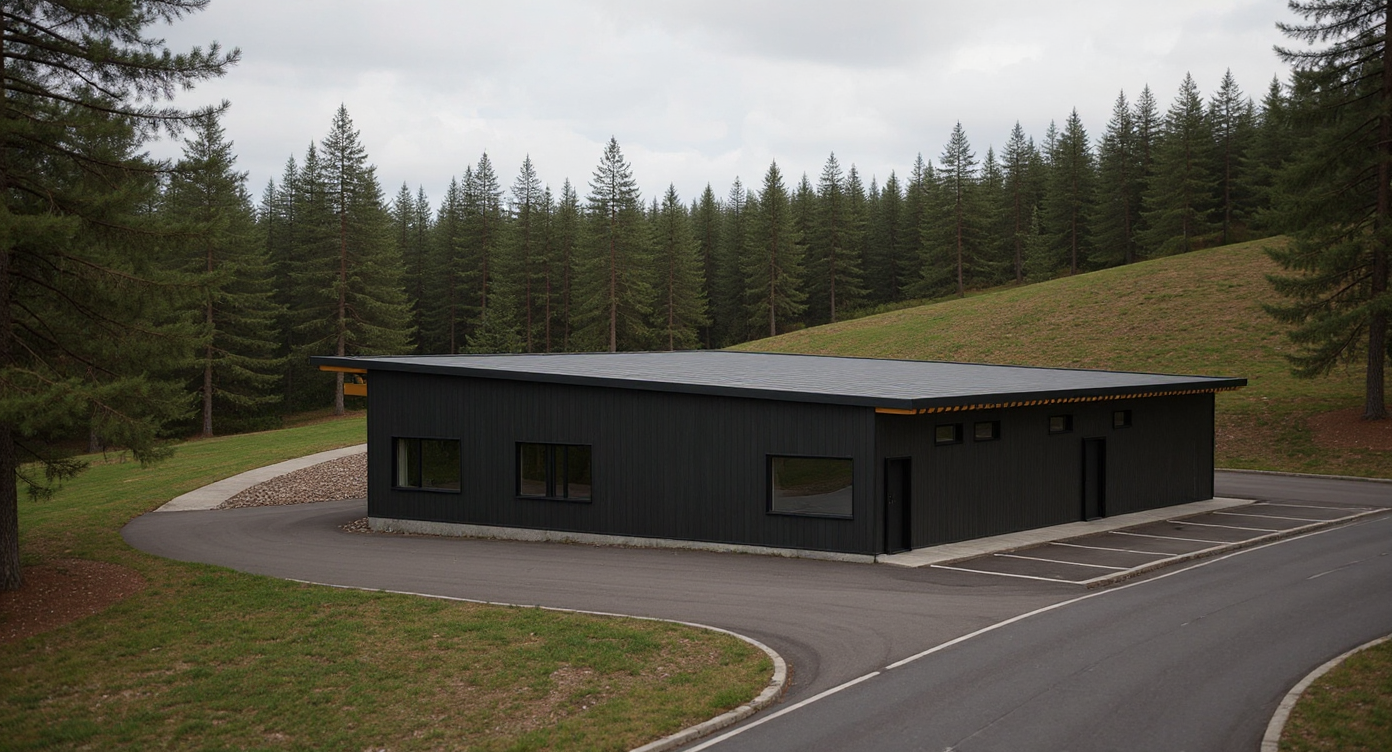 the building has am asphault area with few parking spots behind it and a curbed landscape area to the left behind it is a pine tree forest in front of the building is a small hill where a two lane road is the road to the right ends with a parking lot behind the parking lot is a large hill with trees going up it a two lane high way is right before the tree line the two lane road runs parallel to the view of the image but behind the building and sits about 20 feet below the building